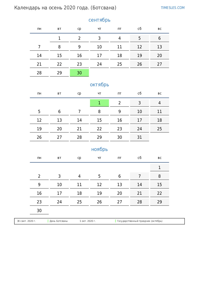 Скачать и распечатать PDF календарь с праздниками и выходными на осень 2020 года для Ботсваны
