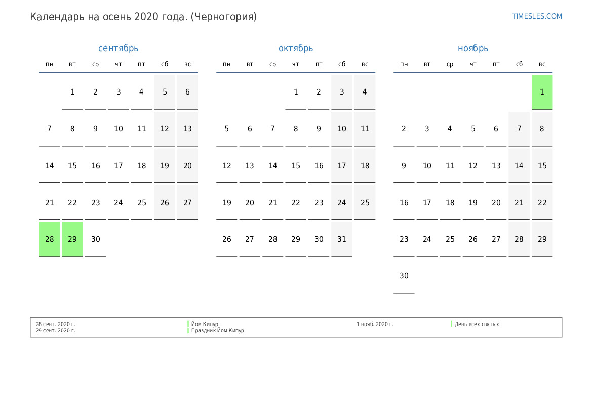 Скачать и распечатать PDF календарь с праздниками и выходными на осень 2020 года для Черногории