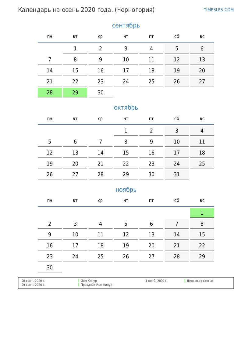 Осенью 2020 года в Черногории 4 праздничных и выходных дня. Осень 2020 года начинается во вторник и заканчивается в понедельник.