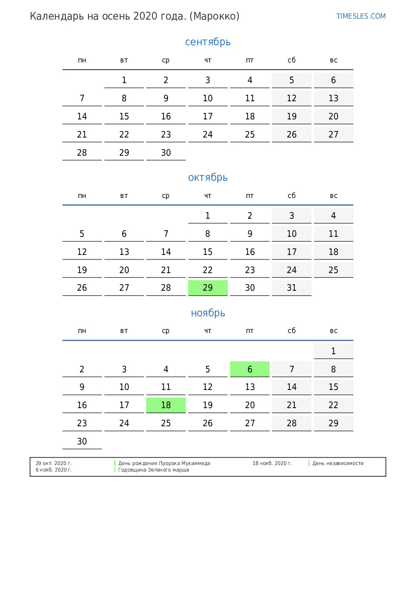 Скачать и распечатать PDF календарь с праздниками и выходными на осень 2020 года для Марокко