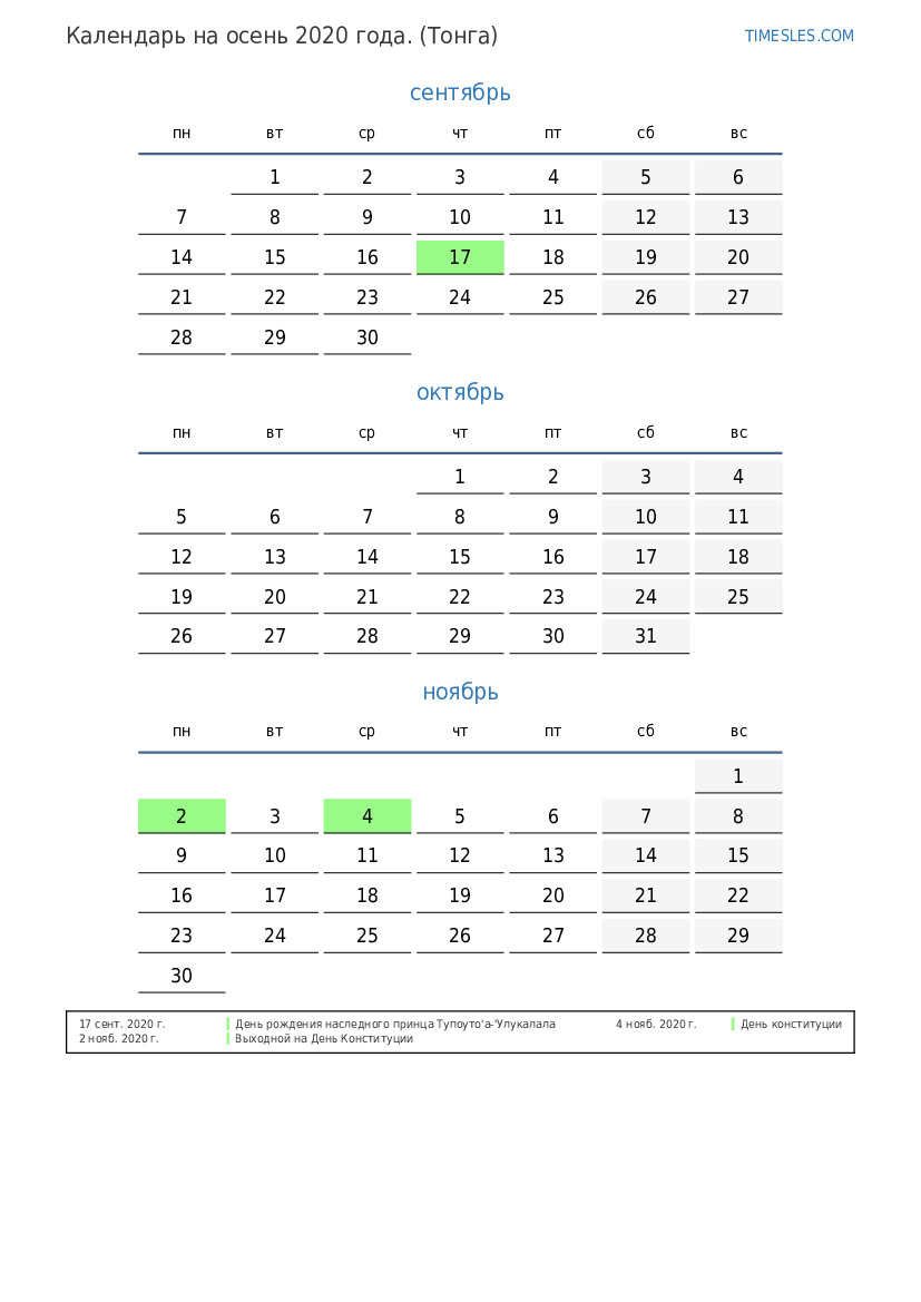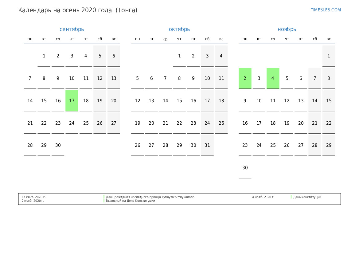 Скачать и распечатать PDF календарь с праздниками и выходными на осень 2020 года для Тонги