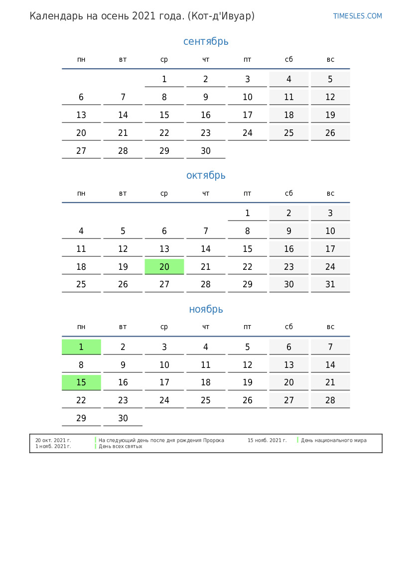 Календарь на осень 2021 года для Кот-д'Ивуара
