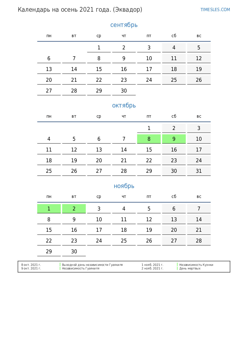 Скачать и распечатать PDF календарь с праздниками и выходными на осень 2021 года для Эквадора