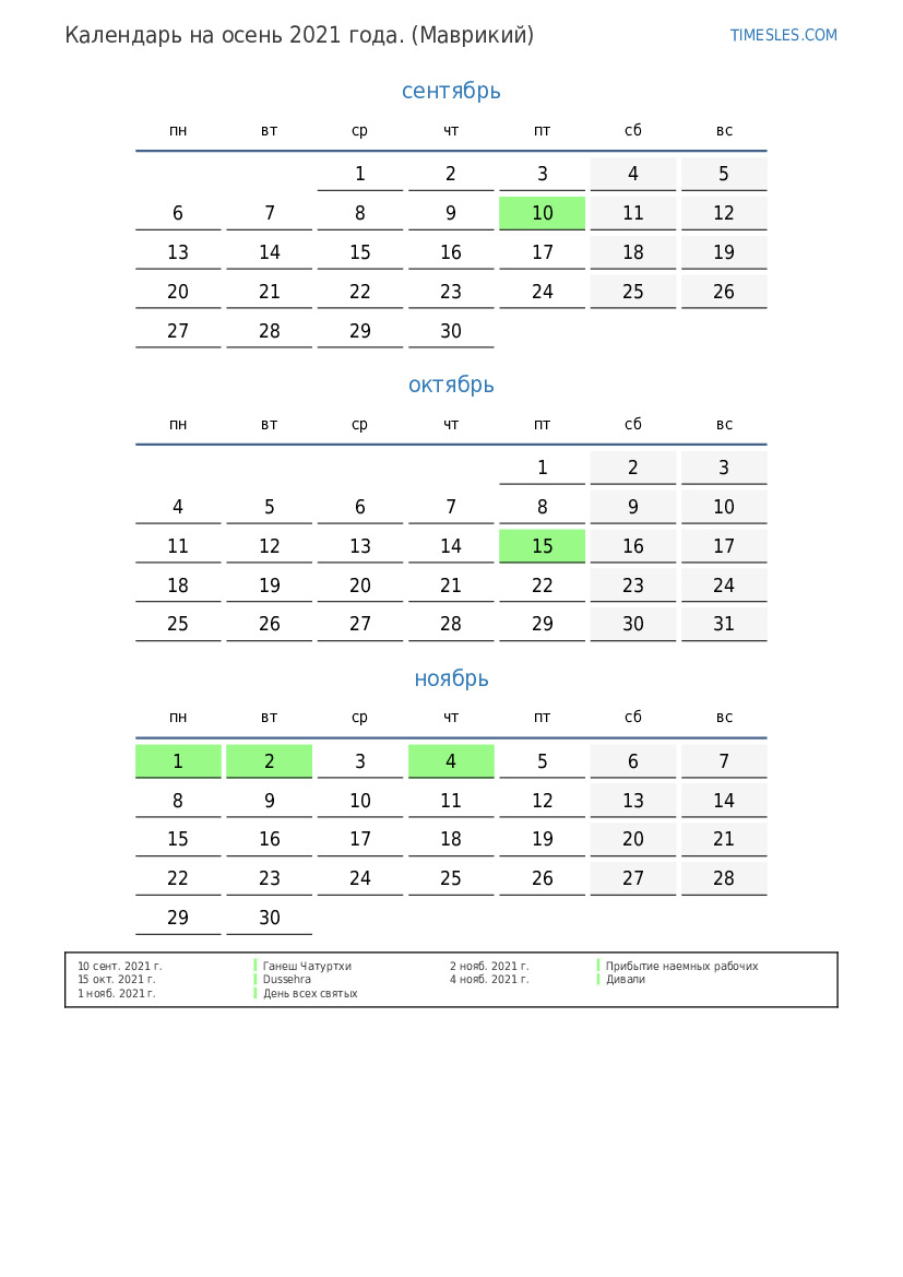 Скачать и распечатать PDF календарь с праздниками и выходными на осень 2021 года для Маврикия