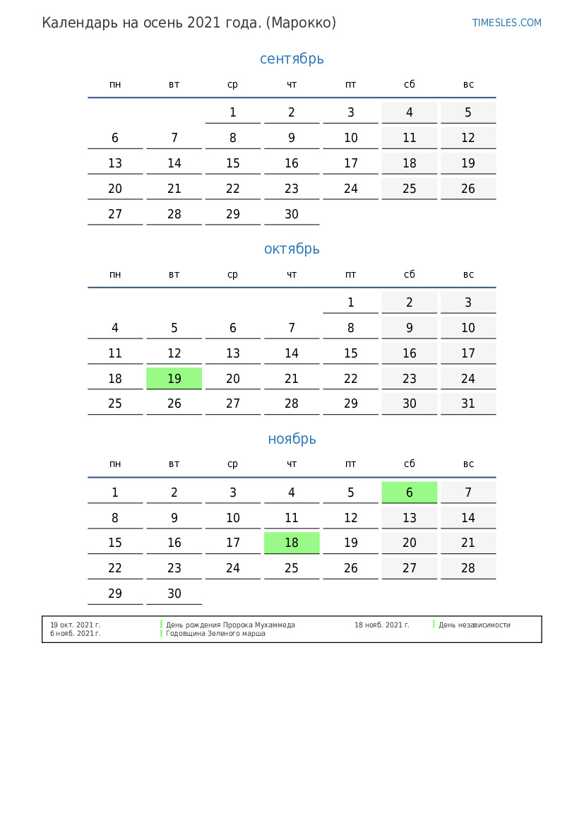 Календарь праздников и выходных дней на осень 2021 года для Марокко