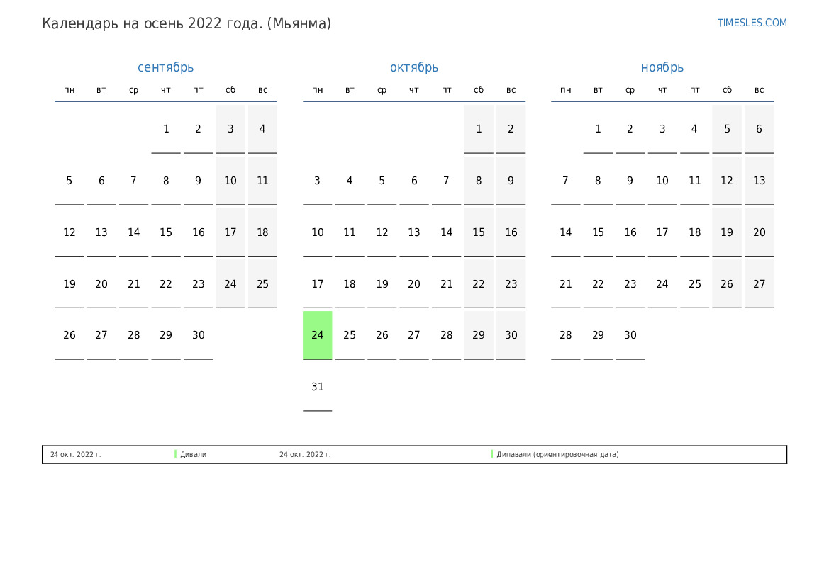 Осенью 2022 года в Мьянме 3 праздничных и выходных дня. Осень 2022 года начинается в четверг и заканчивается в среду.
