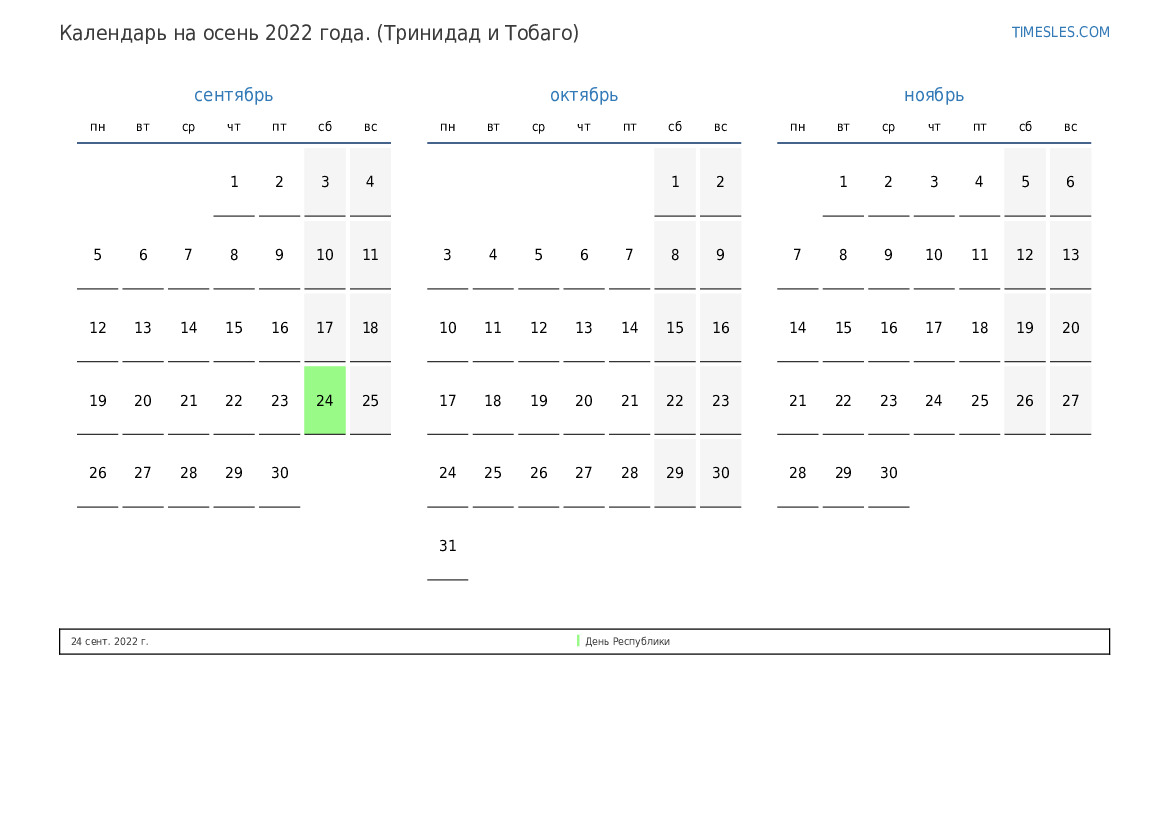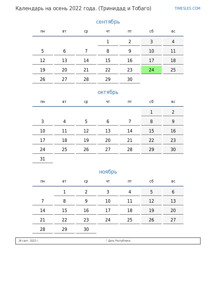 Календарь на осень 2022 года для Тринидада и Тобаго