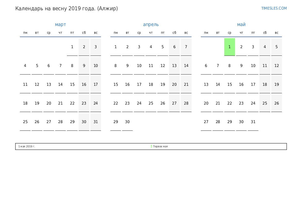 Скачать и распечатать PDF календарь с праздниками и выходными на весну 2019 года для Алжира