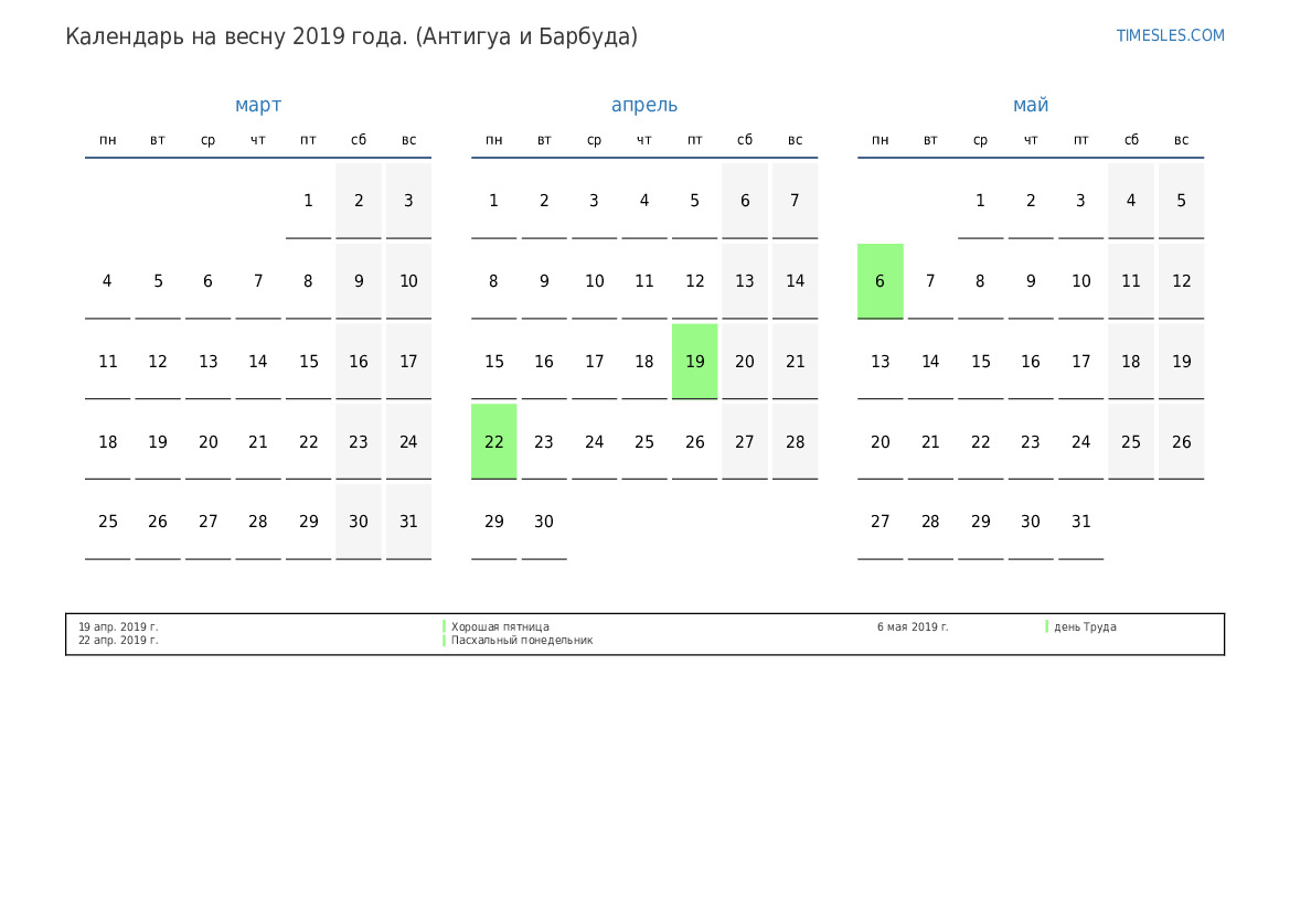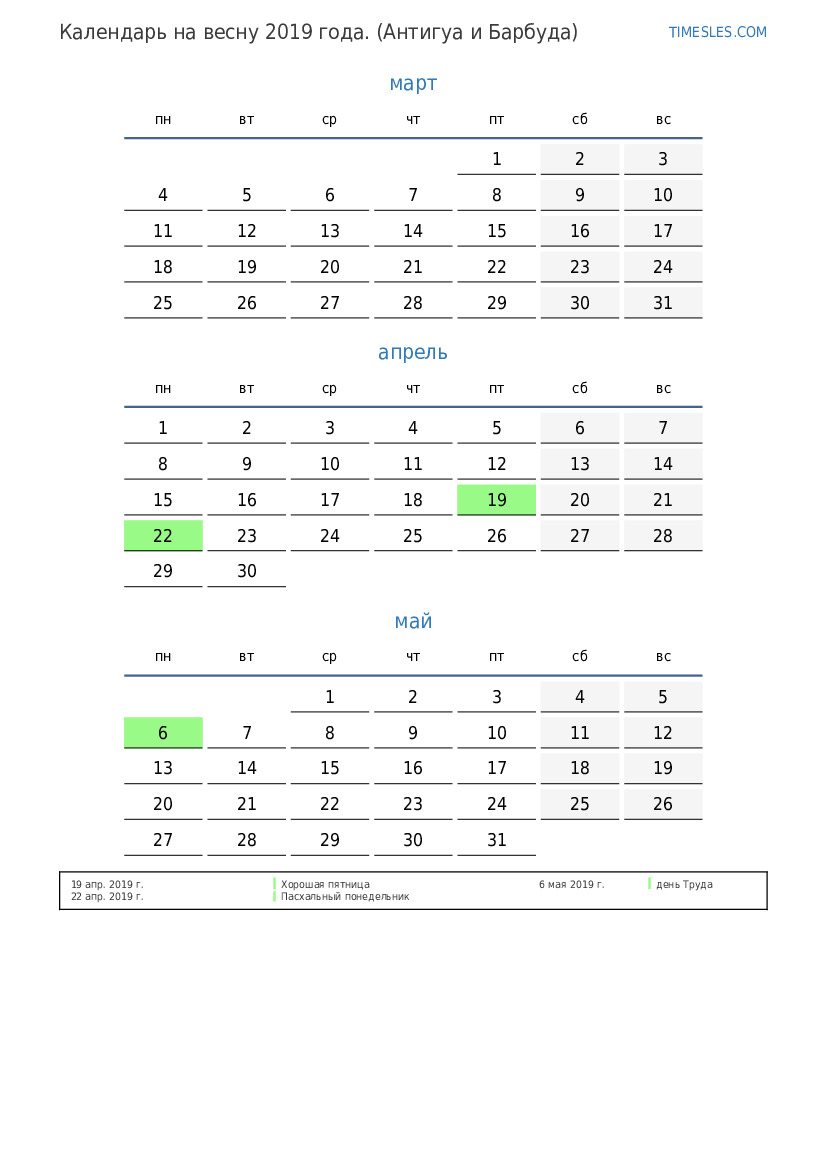 Календарь на весну 2019 года для Антигуа и Барбуды