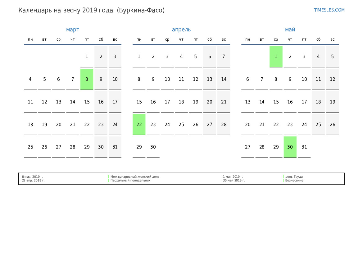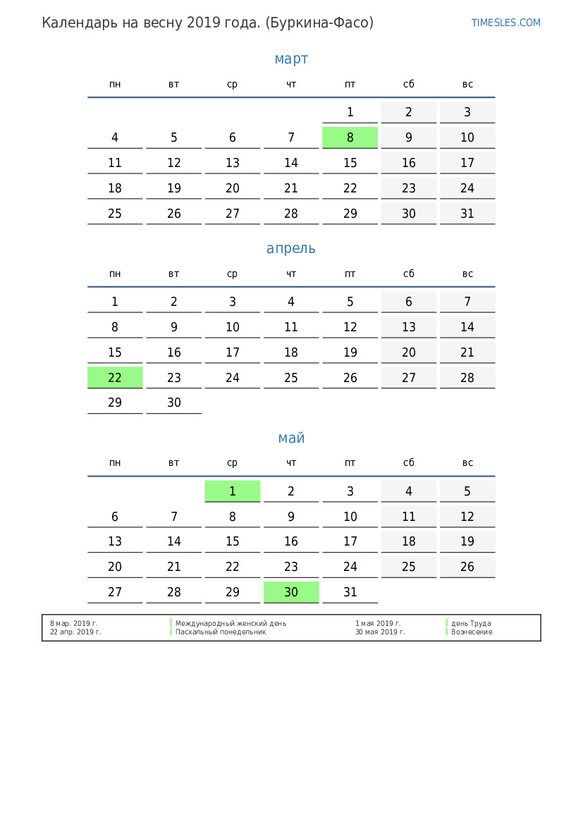 Скачать и распечатать PDF календарь с праздниками и выходными на весну 2019 года для Буркина-Фасо