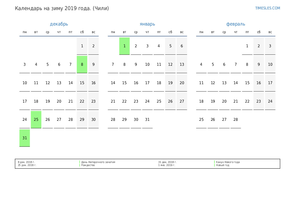 Календарь праздников и выходных дней на весну 2019 года для Чили