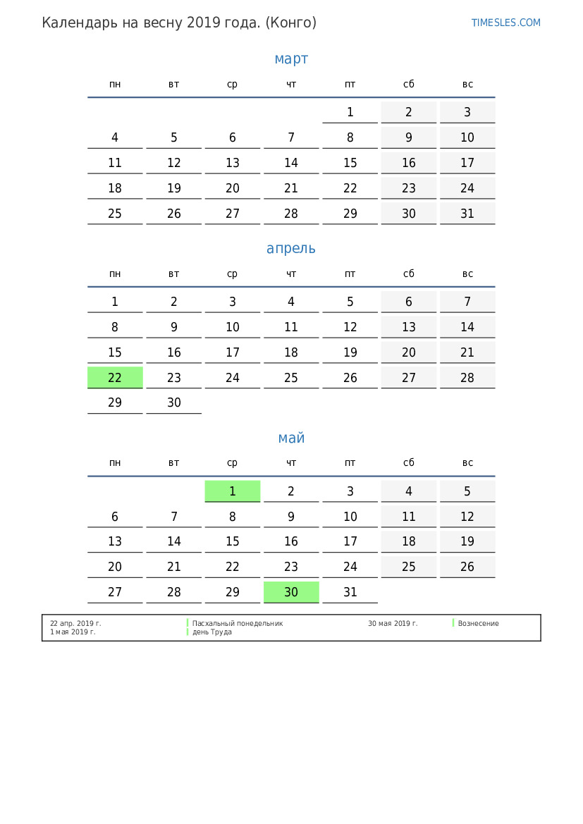 Скачать и распечатать PDF календарь с праздниками и выходными на весну 2019 года для Конго