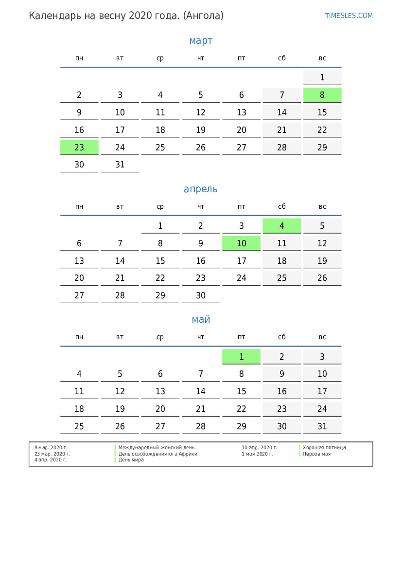 Скачать и распечатать PDF календарь с праздниками и выходными на весну 2020 года для Анголы