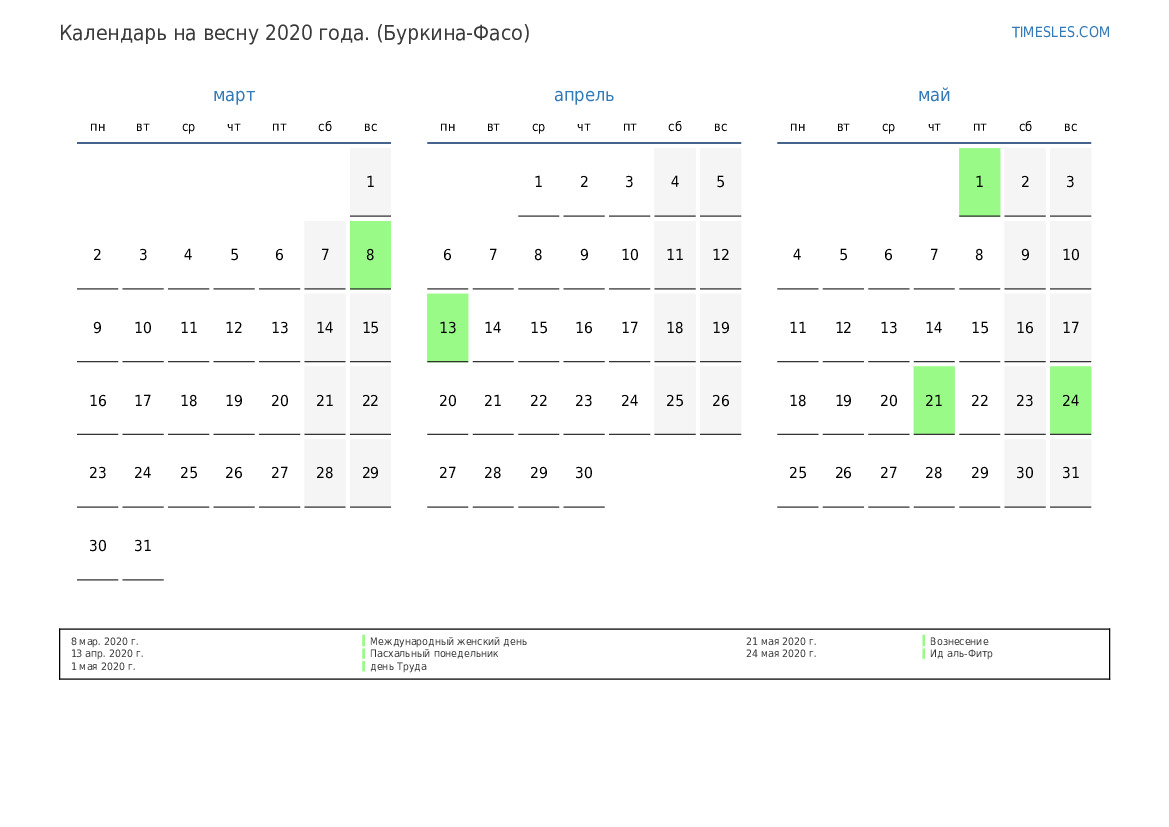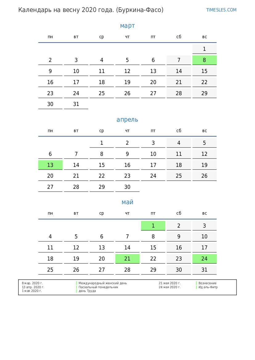 Скачать и распечатать PDF календарь с праздниками и выходными на весну 2020 года для Буркина-Фасо