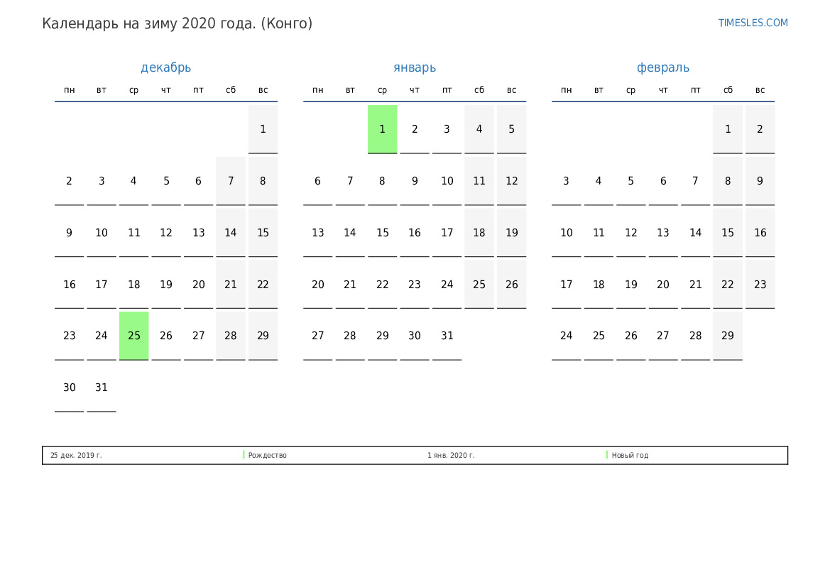 Скачать и распечатать PDF календарь с праздниками и выходными на весну 2020 года для Конго