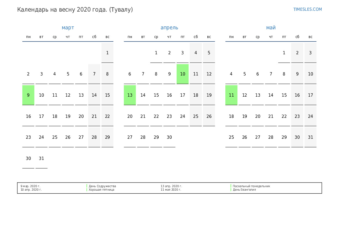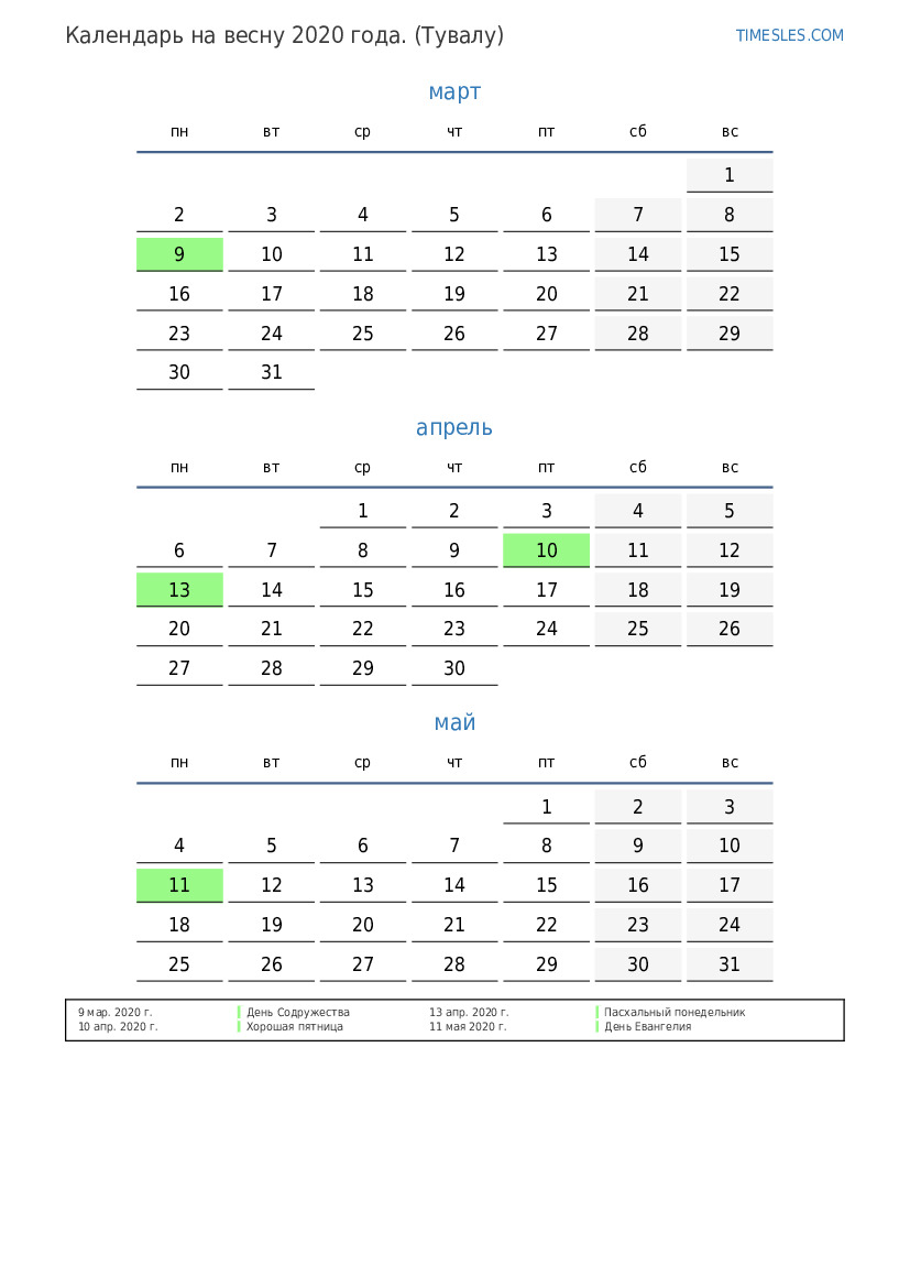 Скачать и распечатать PDF календарь с праздниками и выходными на весну 2020 года для Тувалу