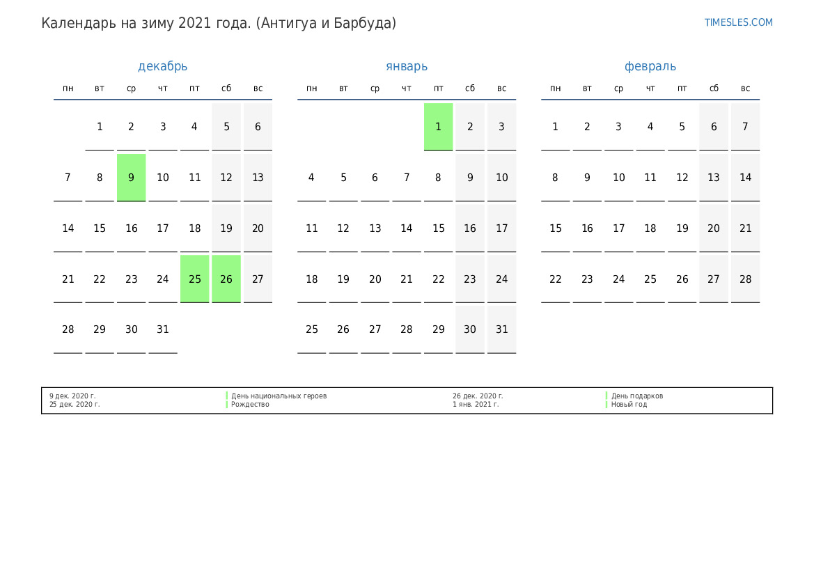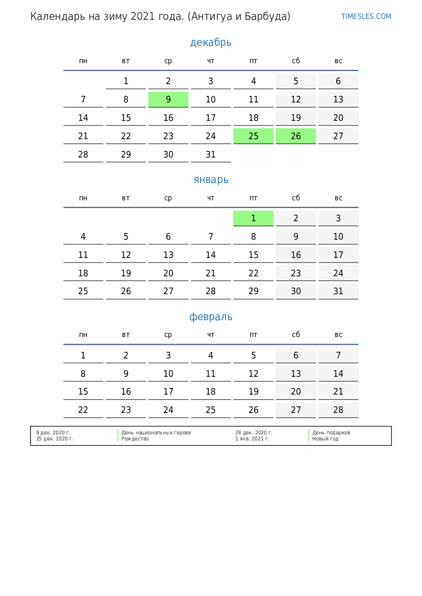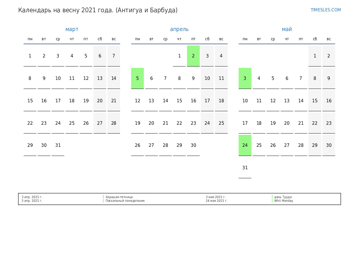 Календарь на весну 2021 года для Антигуа и Барбуды