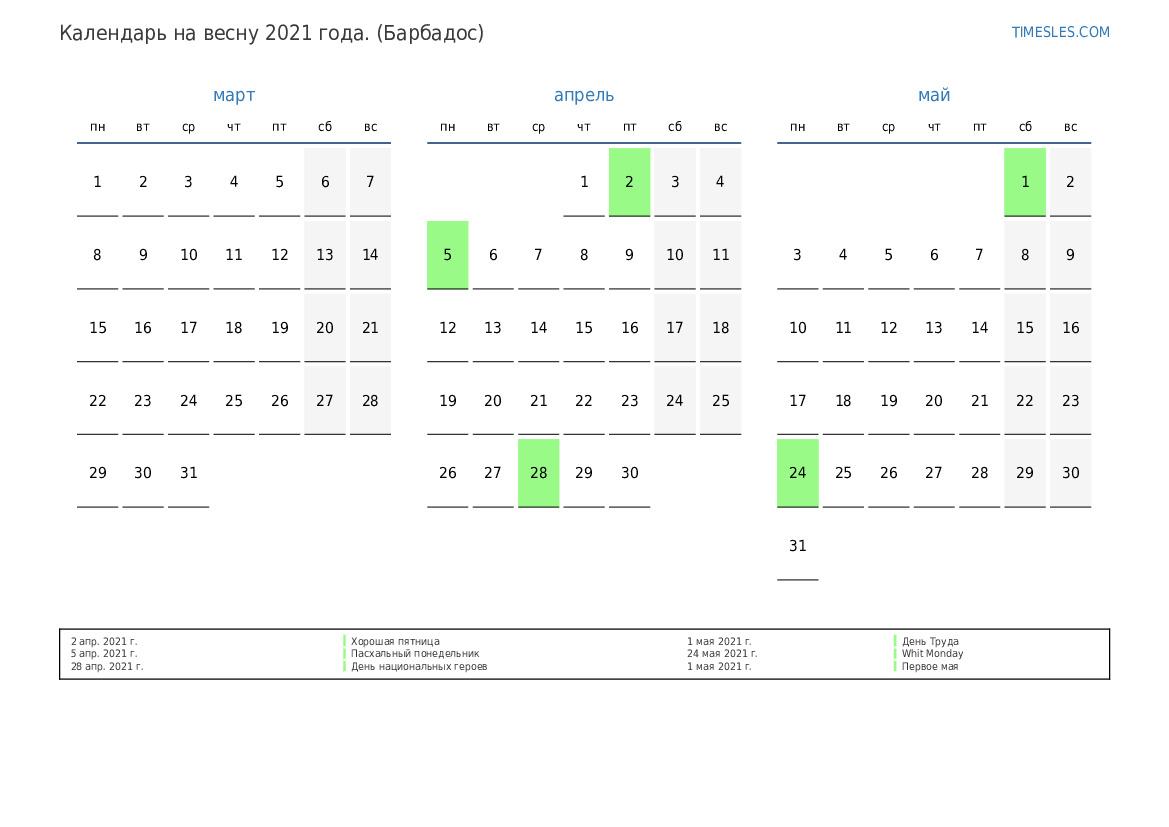 Скачать и распечатать PDF календарь с праздниками и выходными на весну 2021 года для Барбадоса