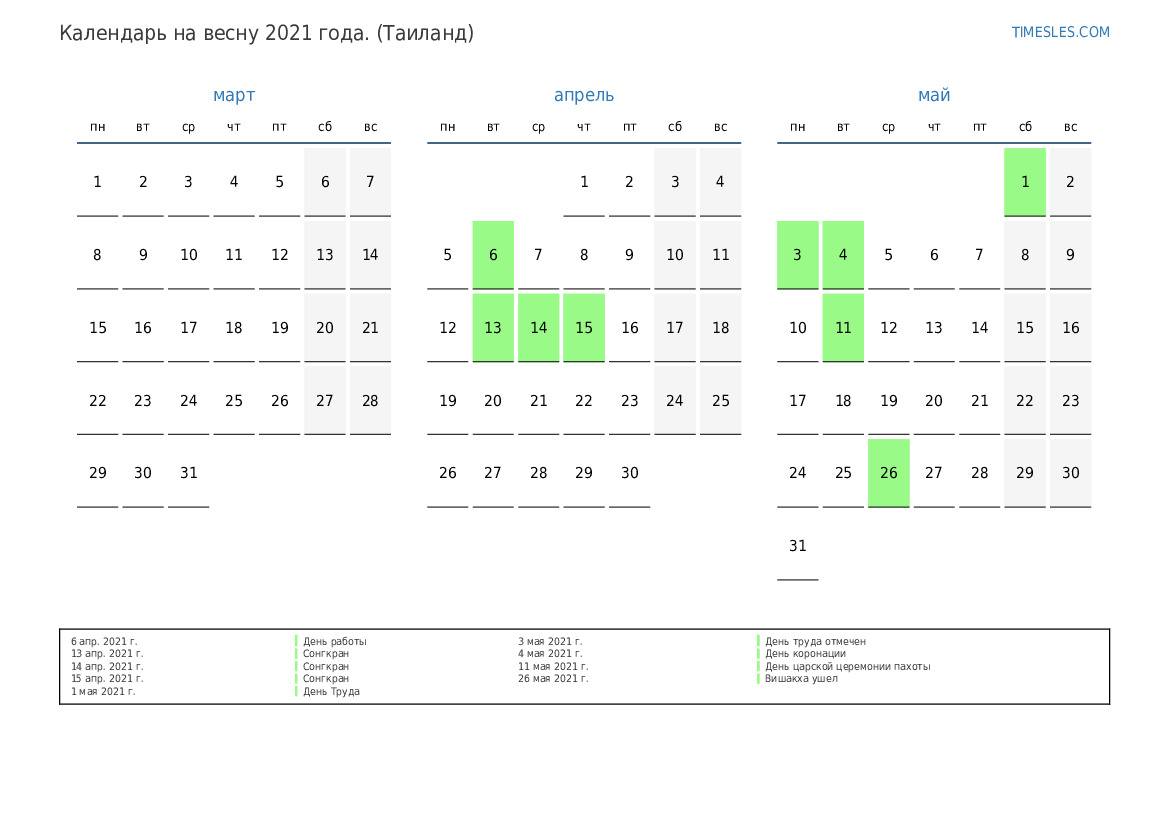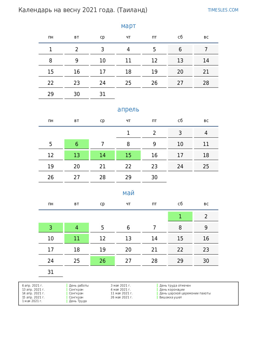 Весной 2021 года в Тайланде 10 праздничных и выходных дней. Весна 2021 года начинается в понедельник и заканчивается в понедельник.