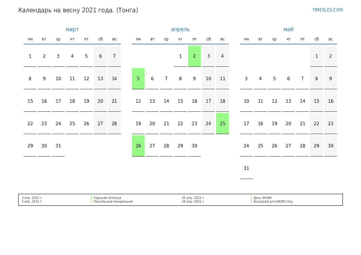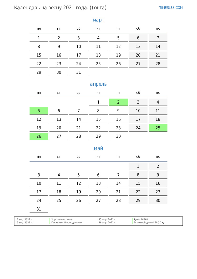Скачать и распечатать PDF календарь с праздниками и выходными на весну 2021 года для Тонги
