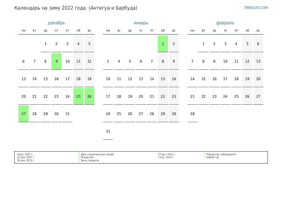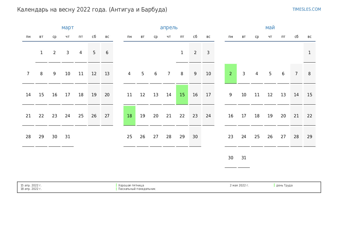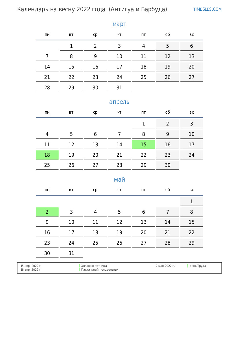 Календарь на весну 2022 года для Антигуа и Барбуды