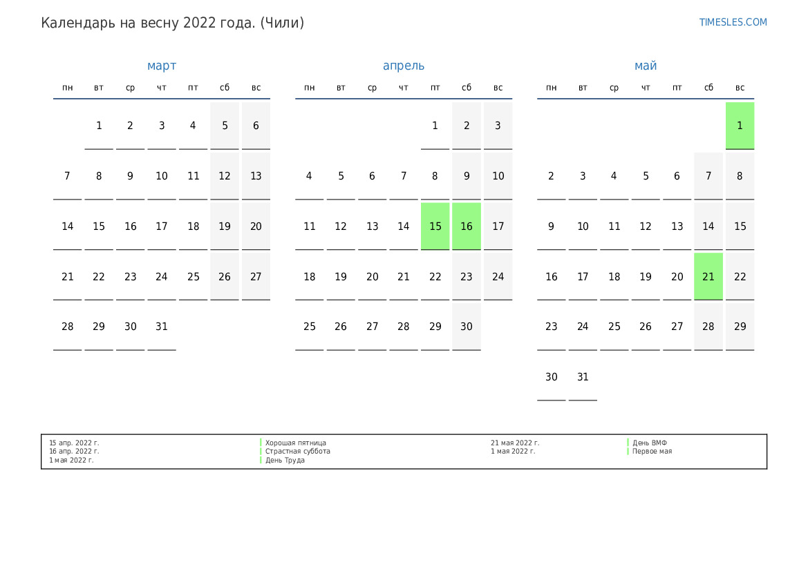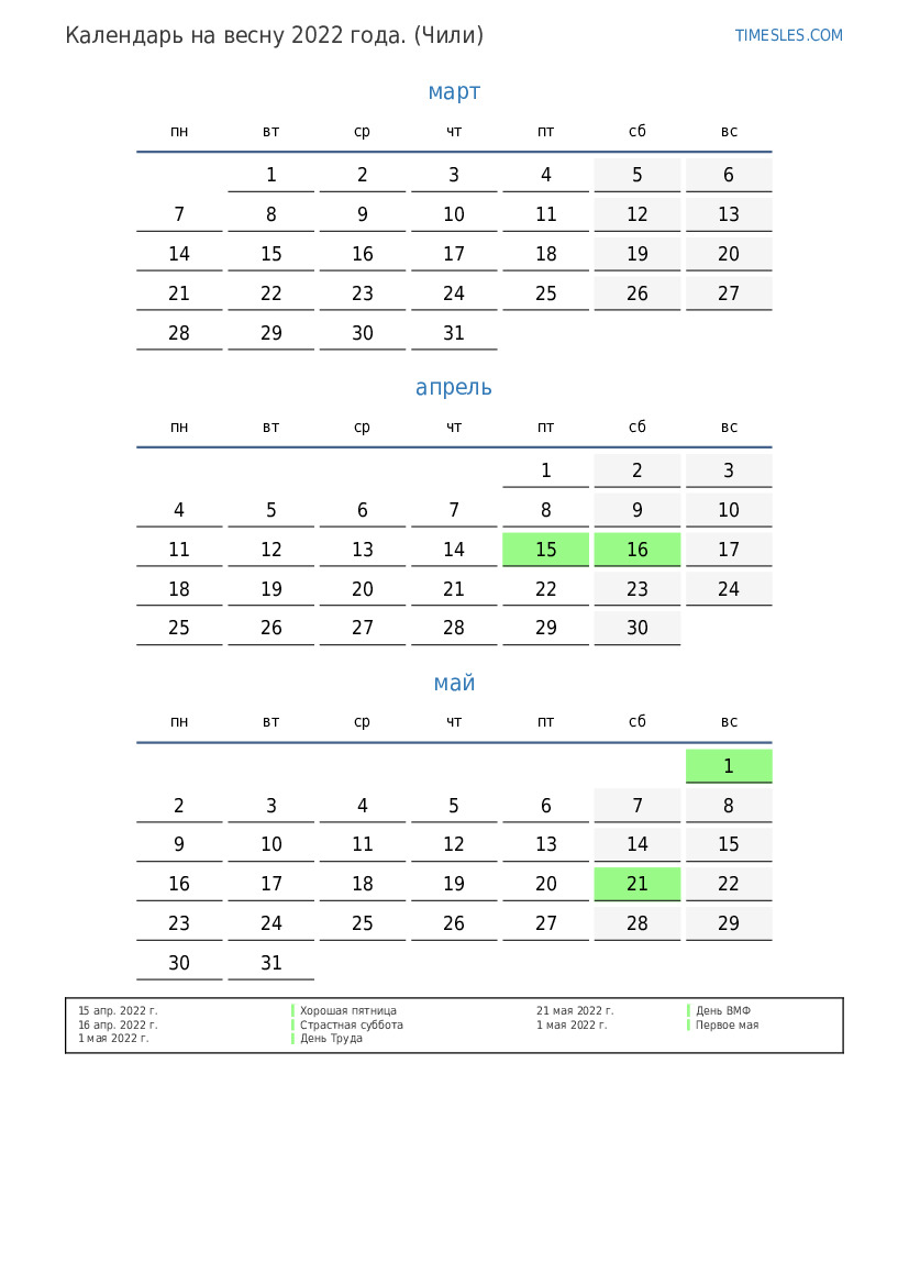 Календарь праздников и выходных дней на весну 2022 года для Чили