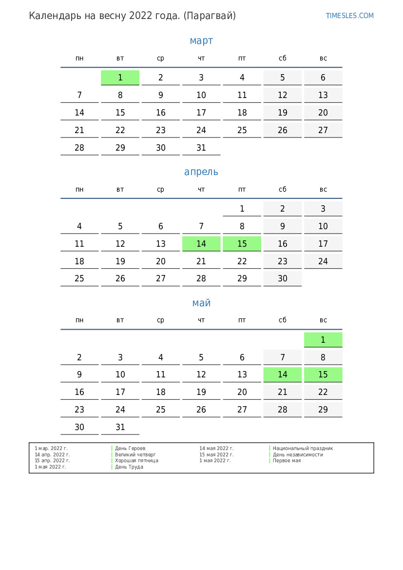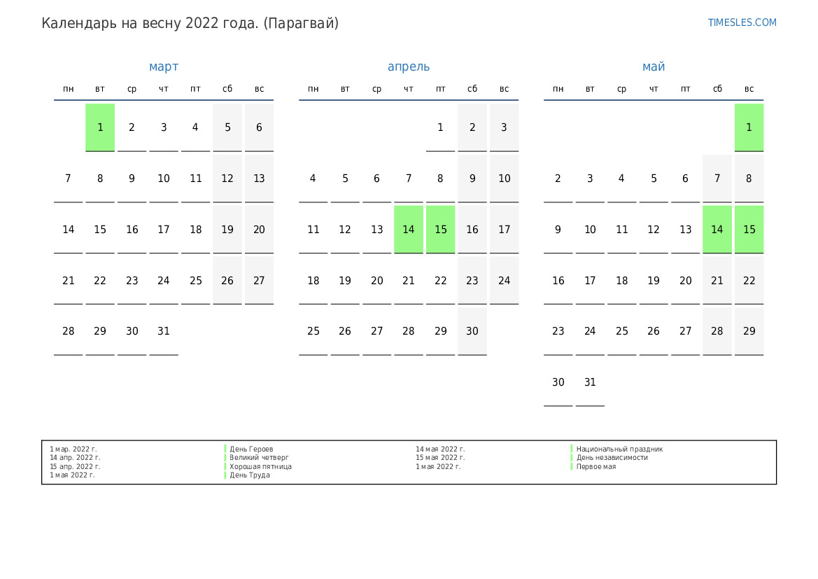 Календарь праздников и выходных дней на весну 2022 года для Парагвая