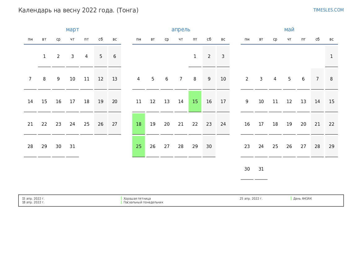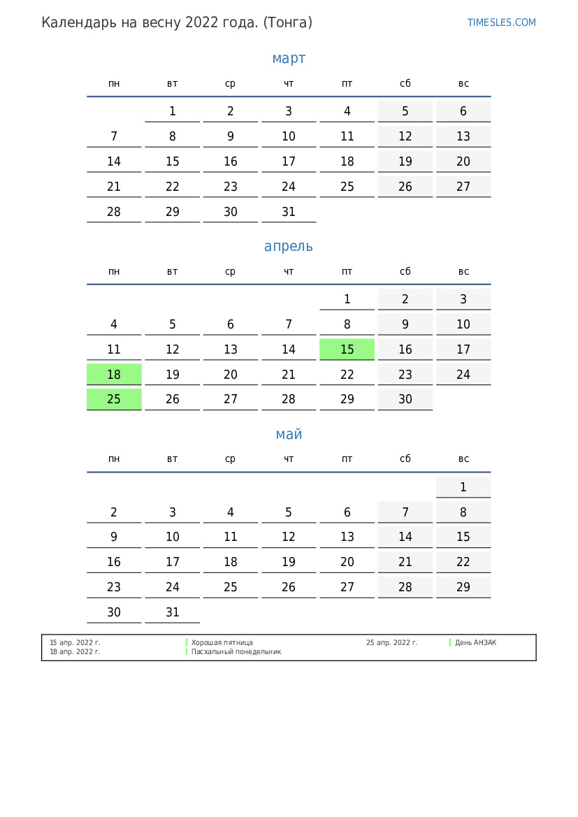 Скачать и распечатать PDF календарь с праздниками и выходными на весну 2022 года для Тонги
