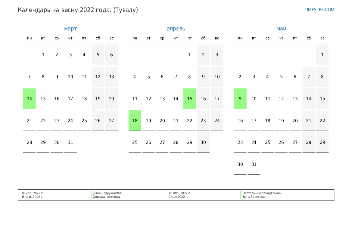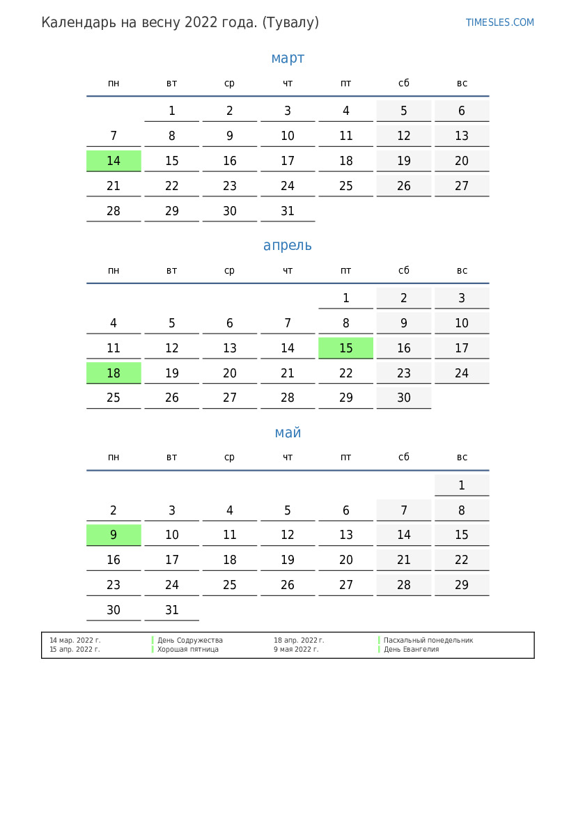 Скачать и распечатать PDF календарь с праздниками и выходными на весну 2022 года для Тувалу