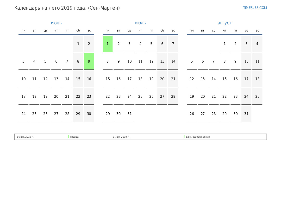 Скачать и распечатать PDF календарь с праздниками и выходными на лето 2019 года для Синт-Мартена