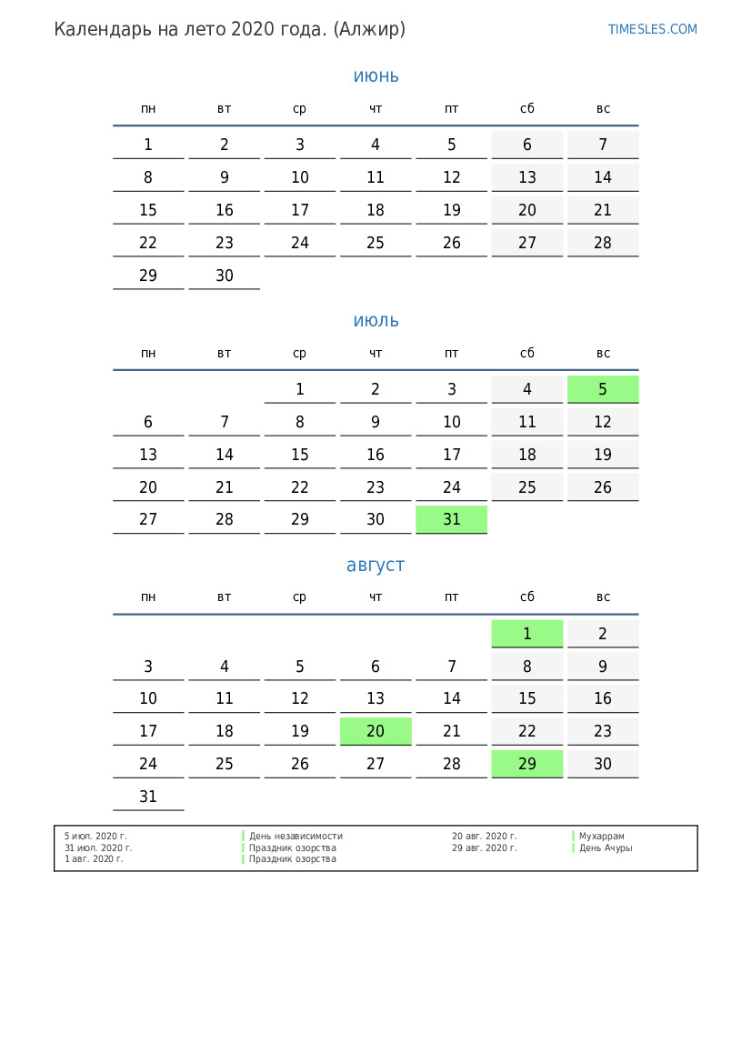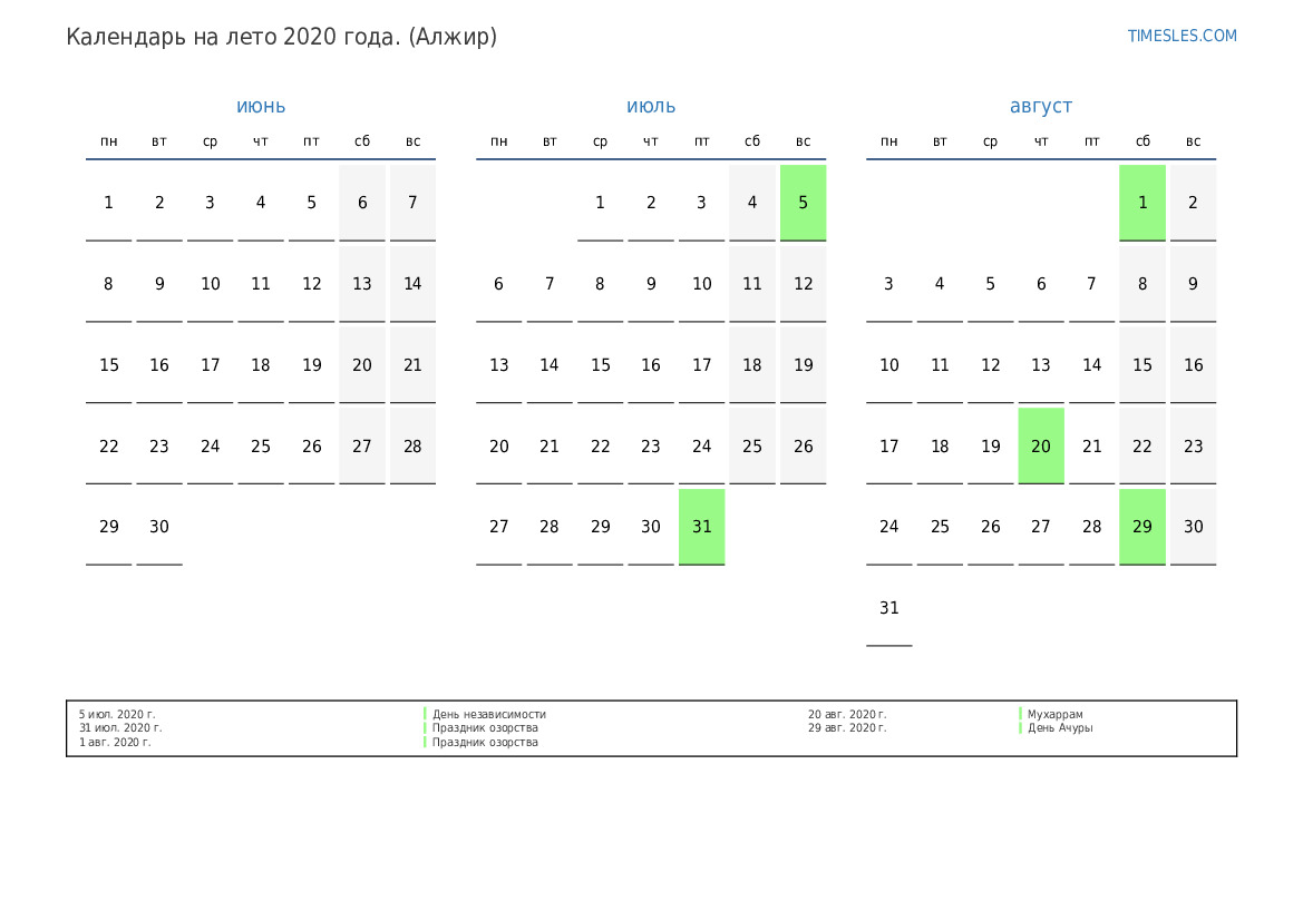 Календарь на лето 2020 года для Алжира