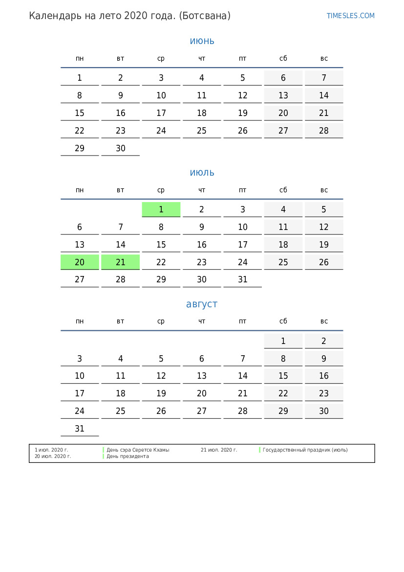 Календарь праздников и выходных дней на лето 2020 года для Ботсваны