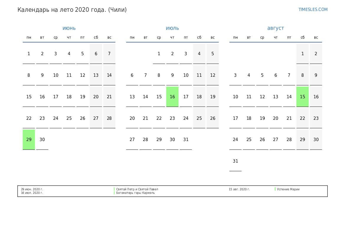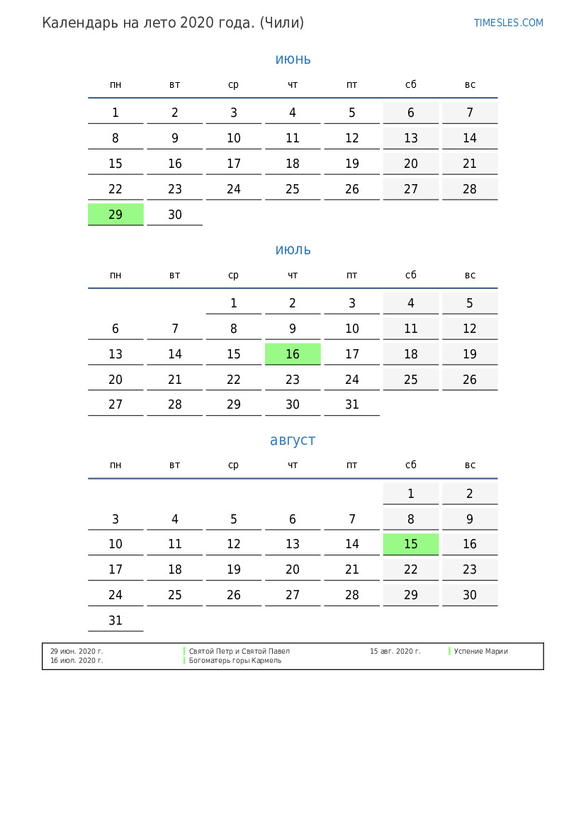 Скачать и распечатать PDF календарь с праздниками и выходными на лето 2020 года для Чили