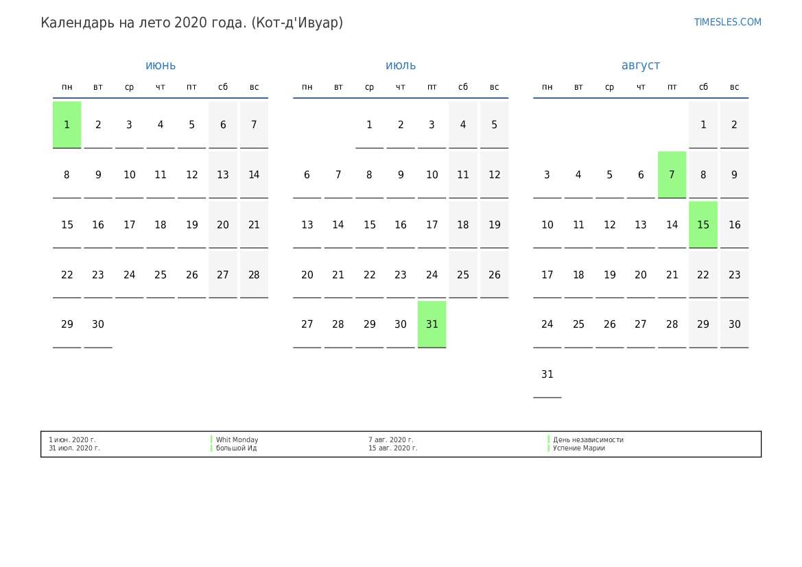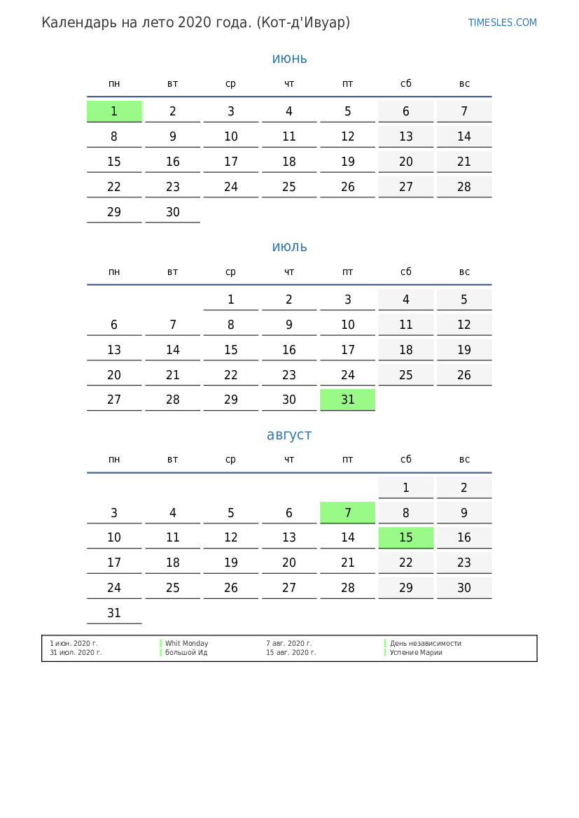 Календарь на лето 2020 года для Кот-д'Ивуара