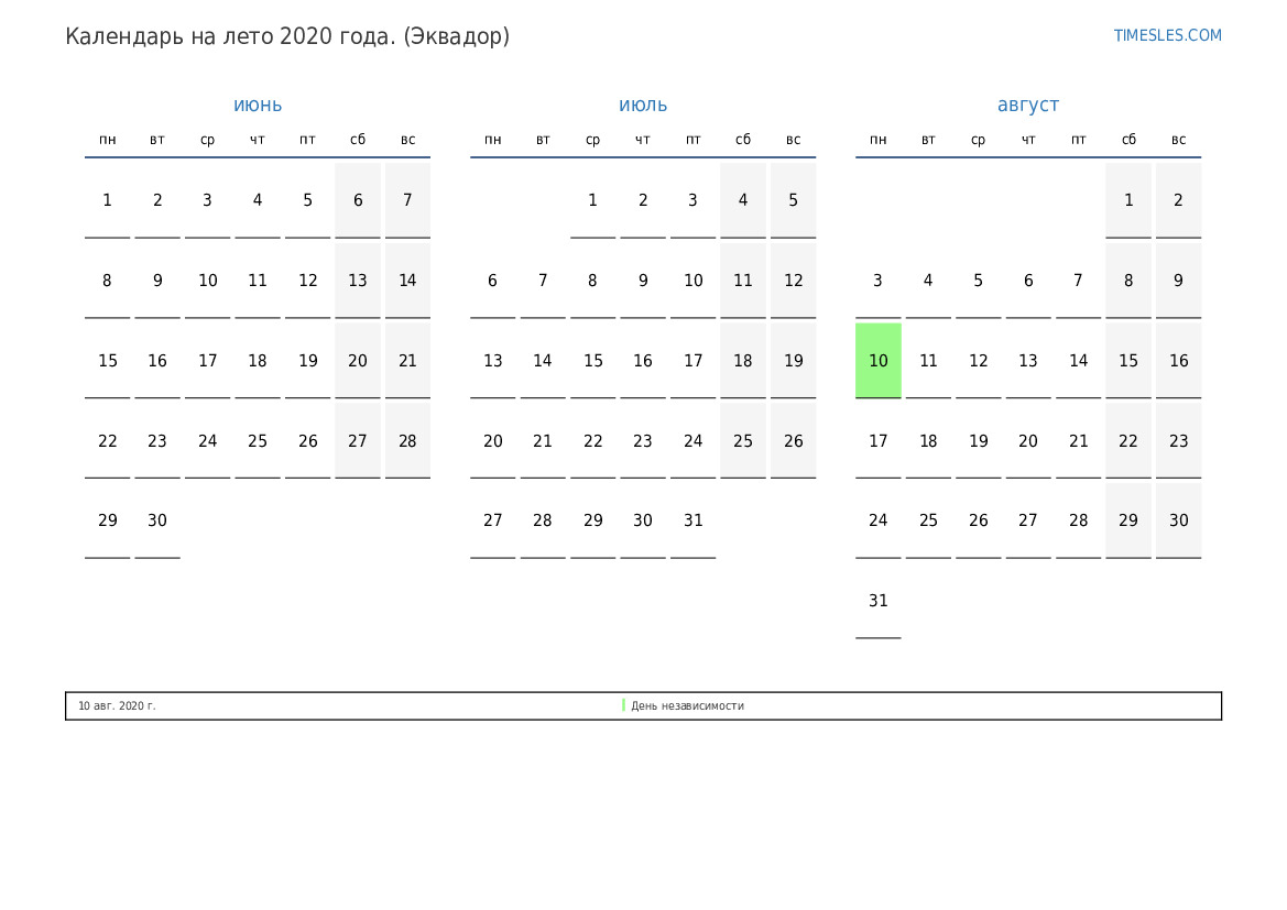 Скачать и распечатать PDF календарь с праздниками и выходными на лето 2020 года для Эквадора