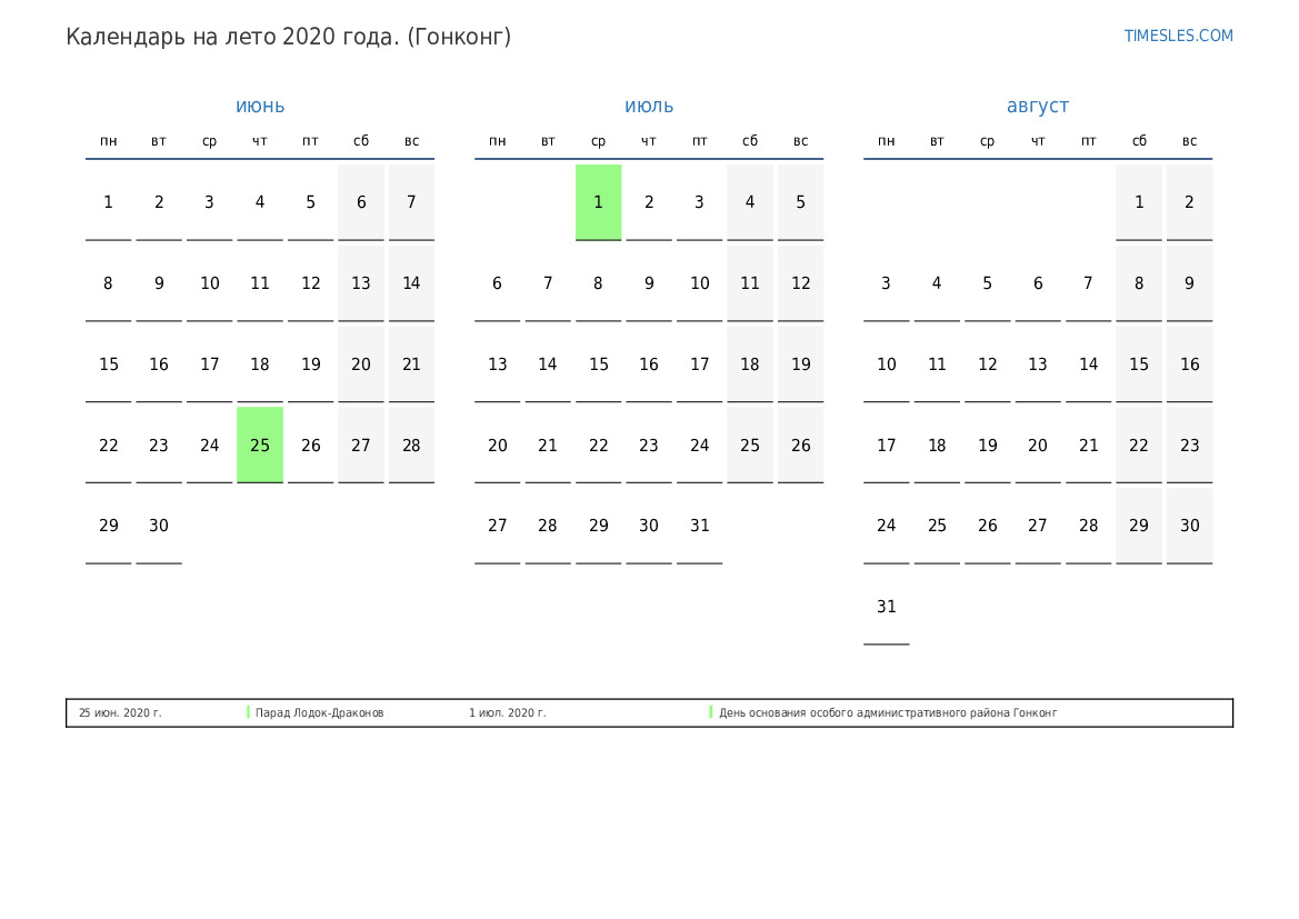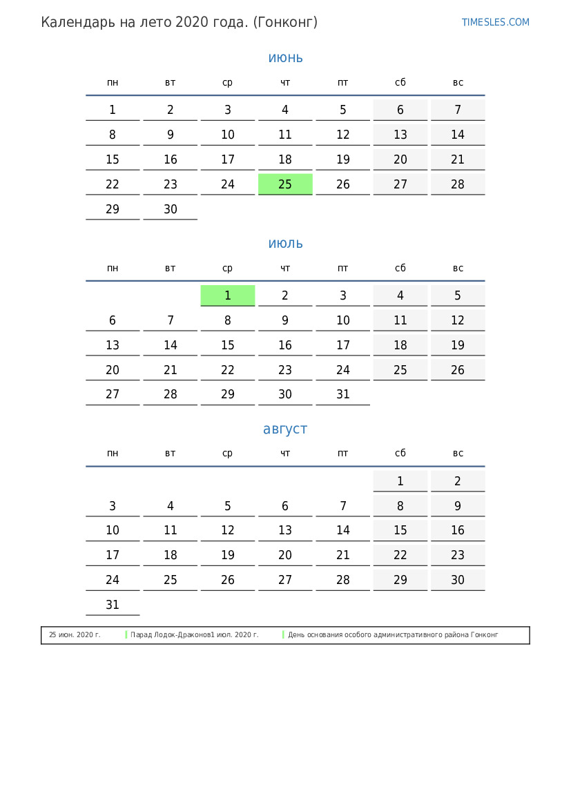 Календарь праздников и выходных дней на лето 2020 года для Гонконга
