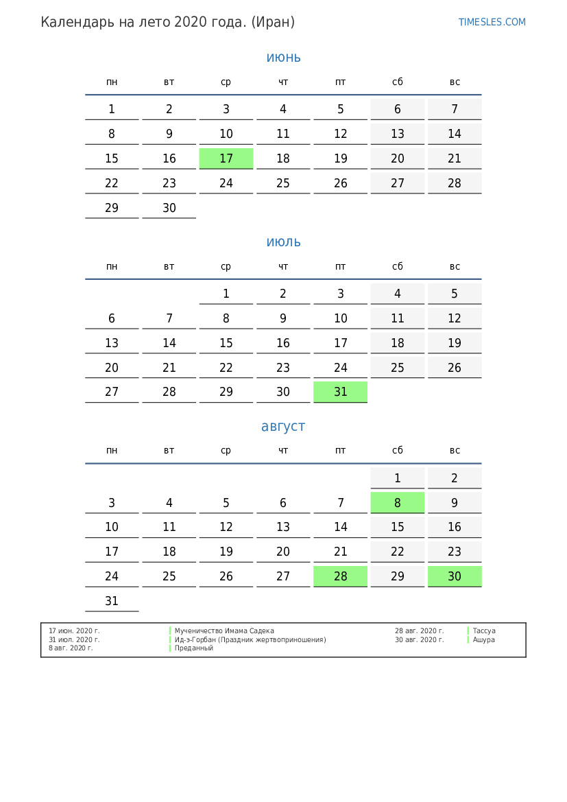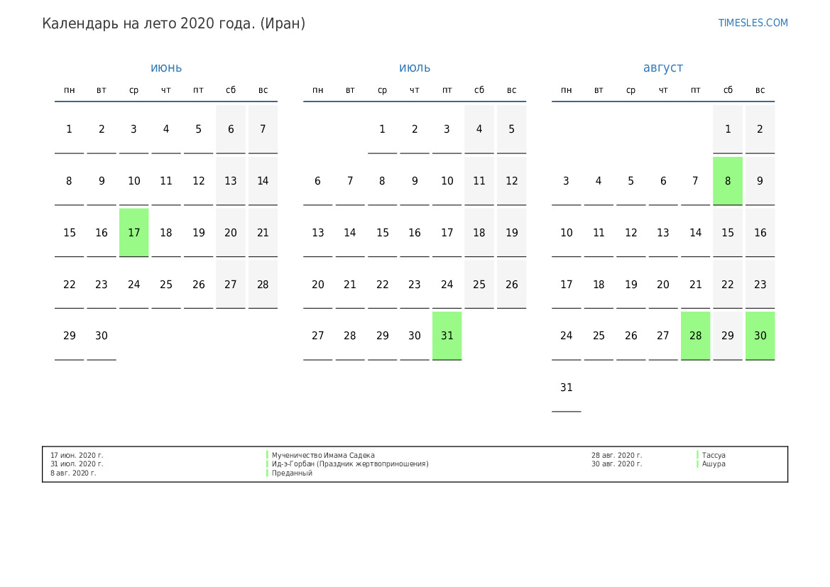 Календарь на лето 2020 года для Ирана