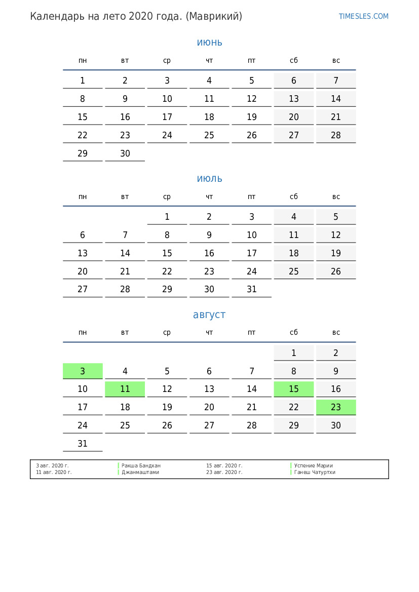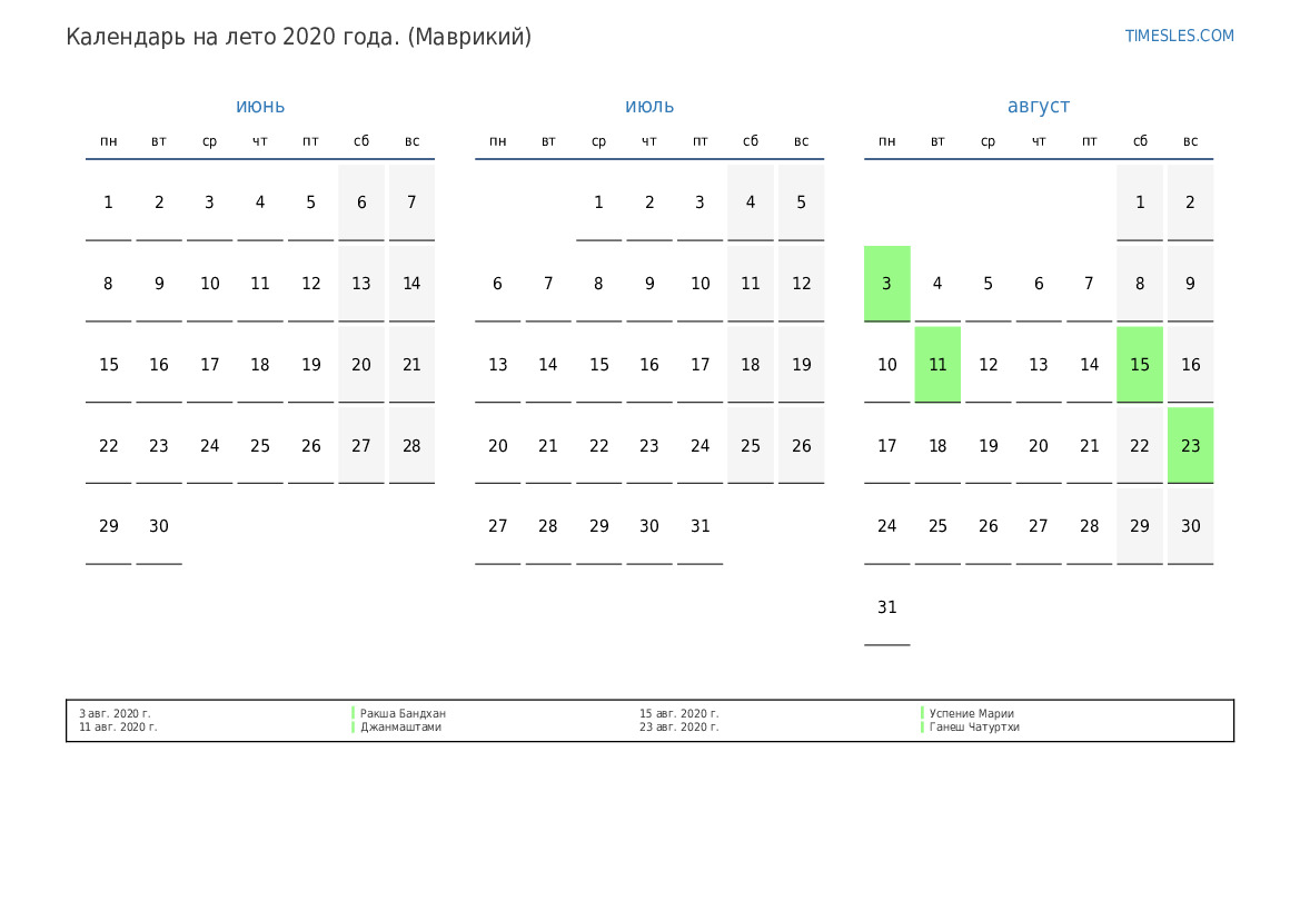 Скачать и распечатать PDF календарь с праздниками и выходными на лето 2020 года для Маврикия