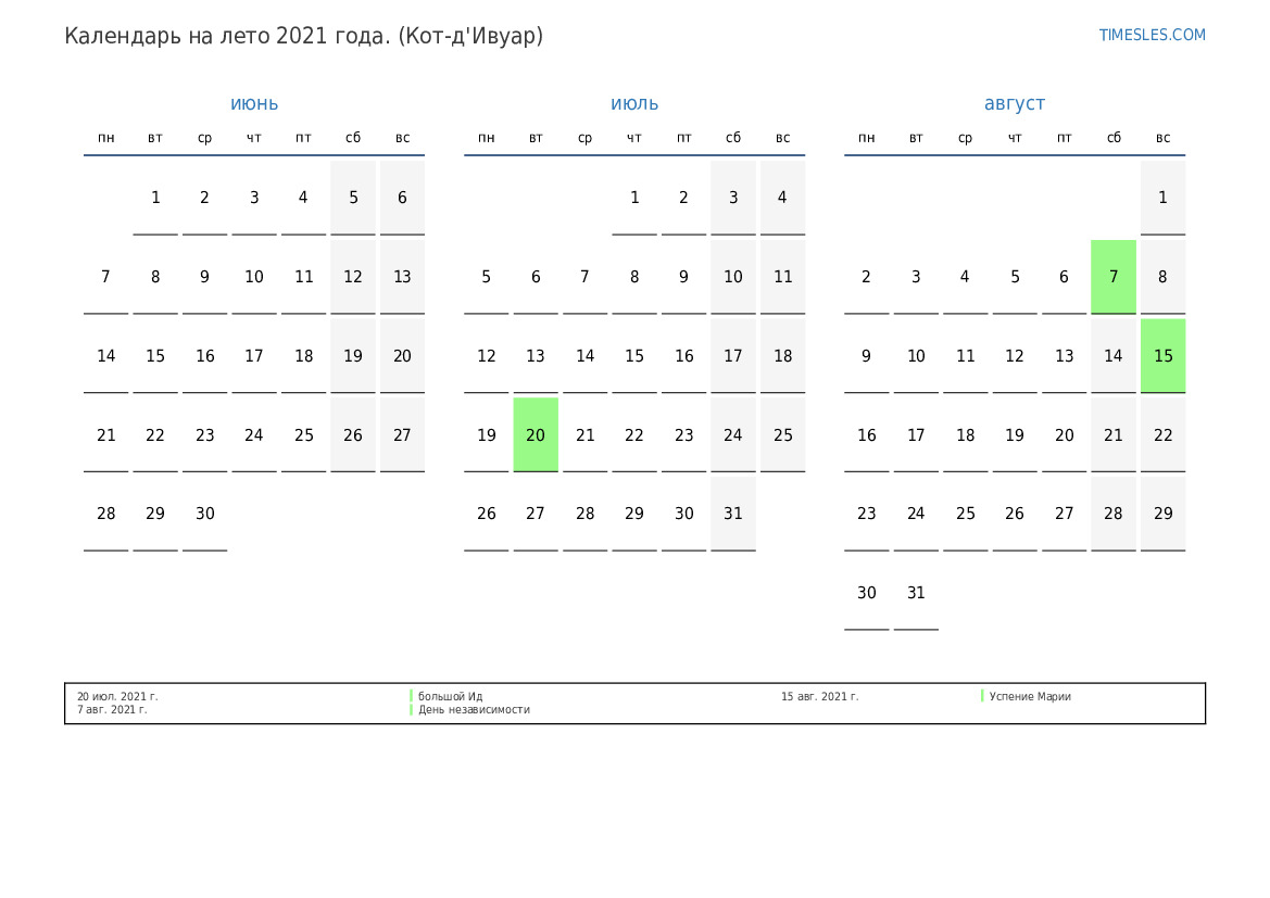Календарь на лето 2021 года для Кот-д'Ивуара
