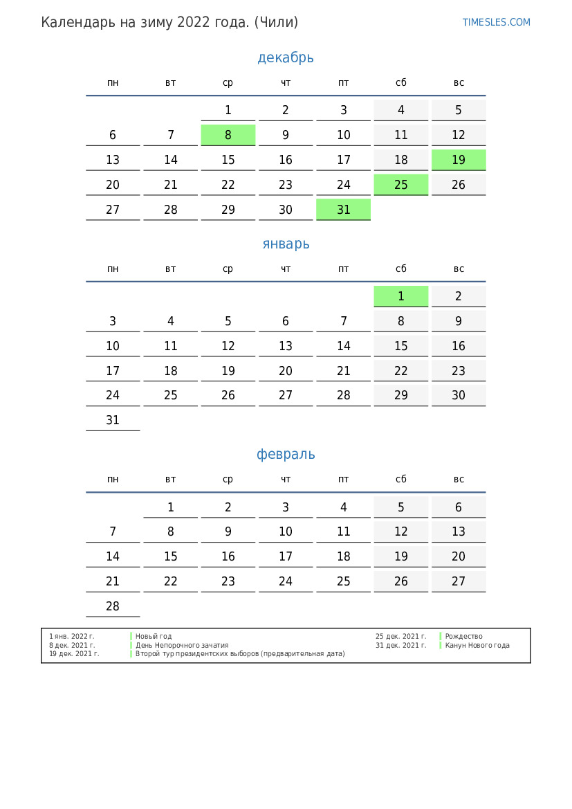 Календарь праздников и выходных дней на лето 2022 года для Чили