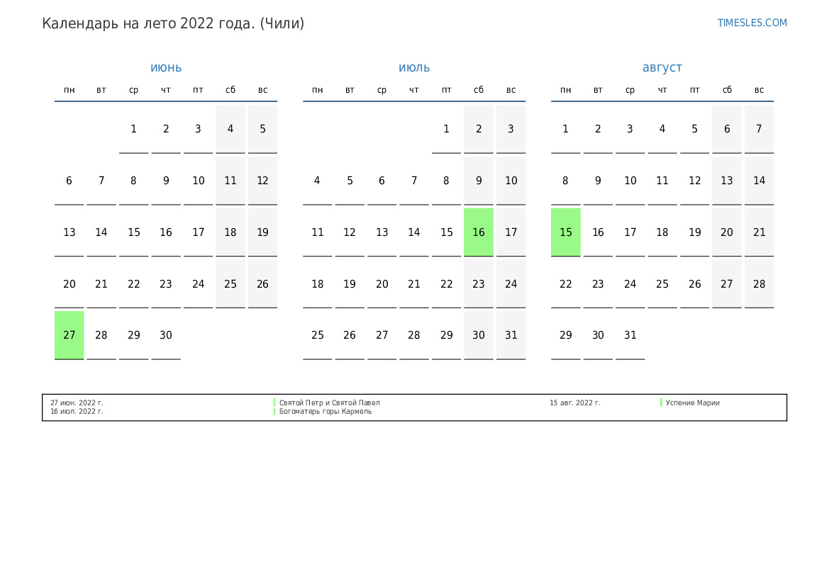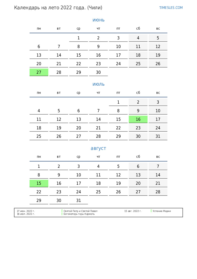 Скачать и распечатать PDF календарь с праздниками и выходными на лето 2022 года для Чили