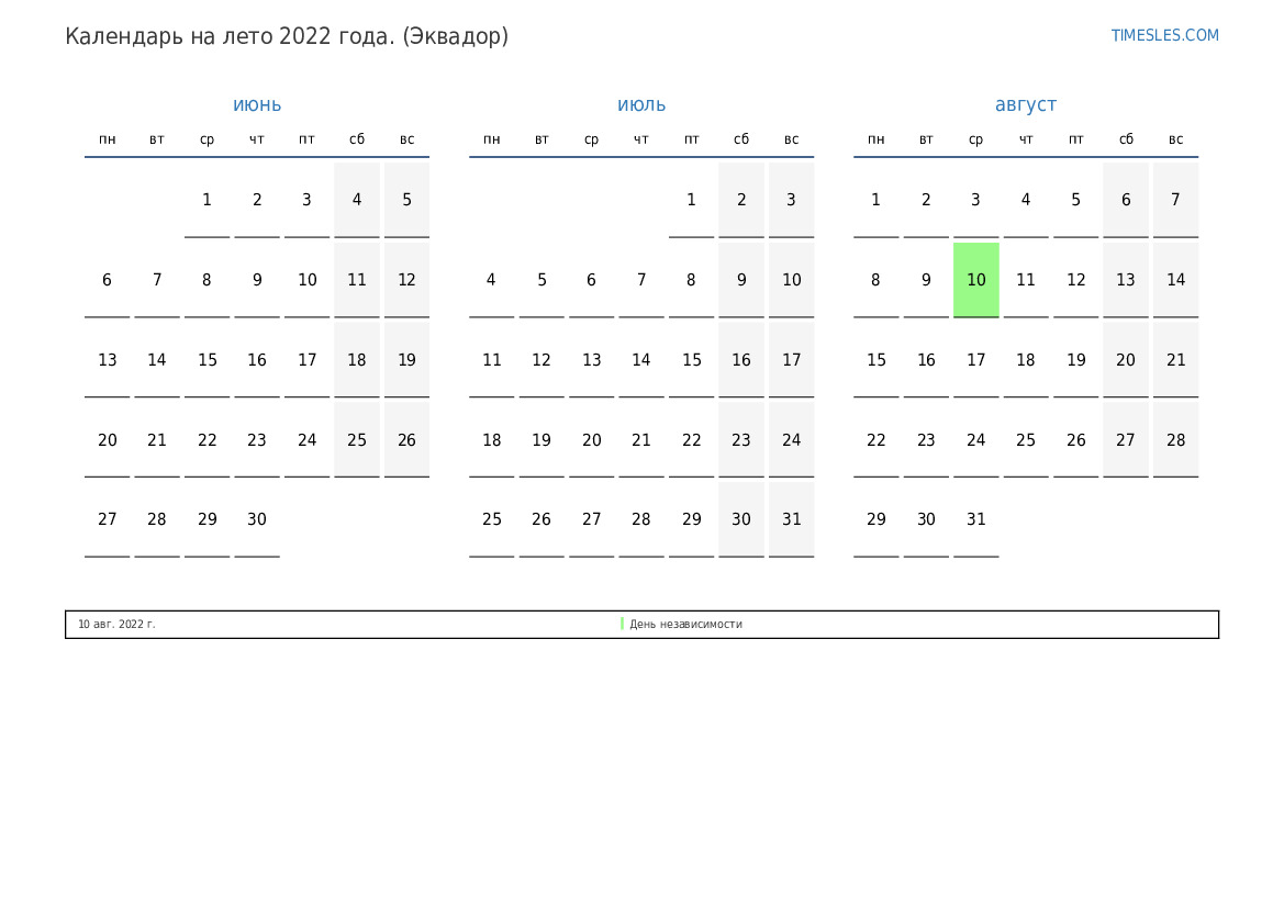 Скачать и распечатать PDF календарь с праздниками и выходными на лето 2022 года для Эквадора