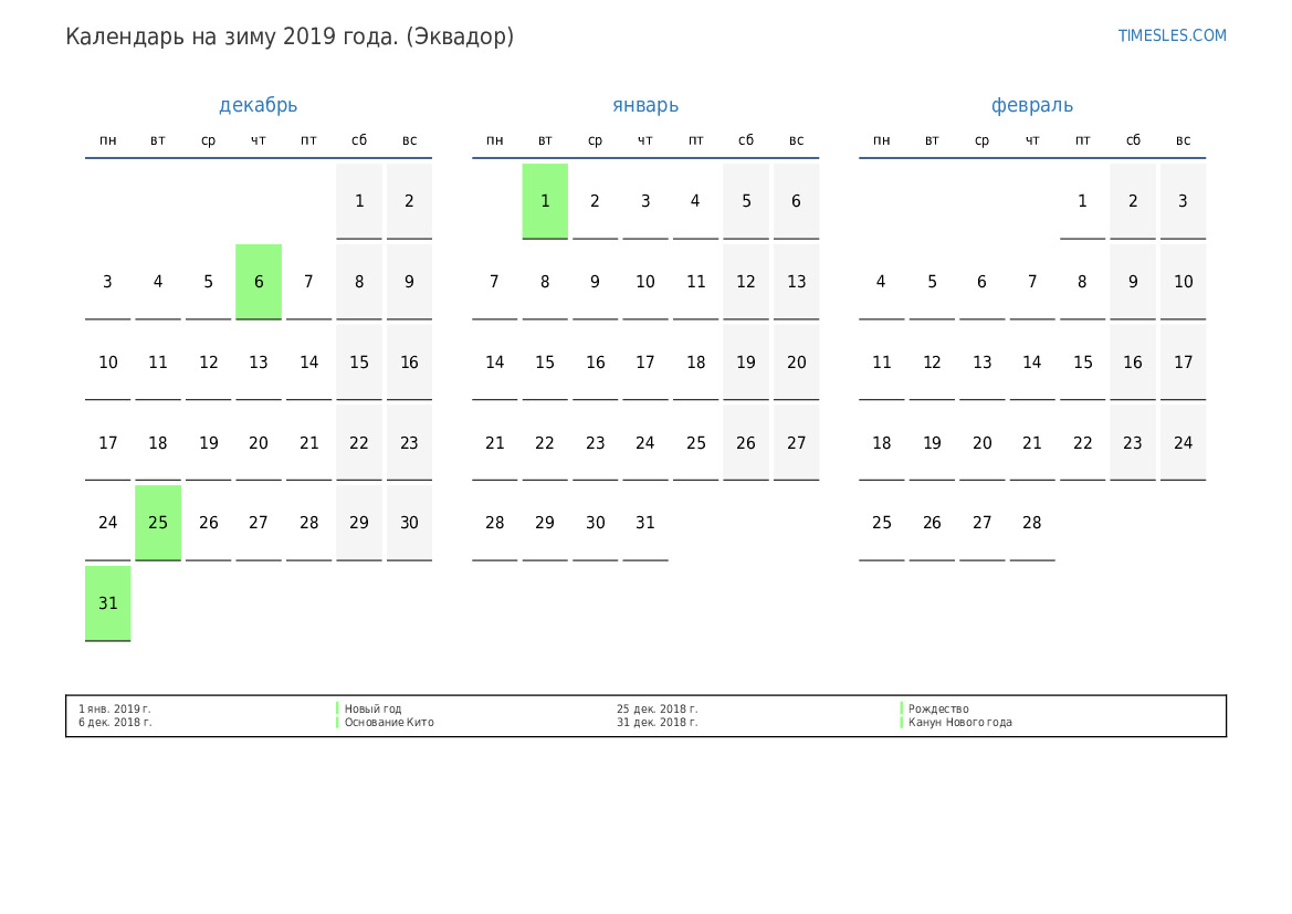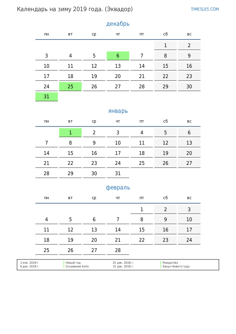 Скачать и распечатать PDF календарь с праздниками и выходными на зиму 2019 года для Эквадора
