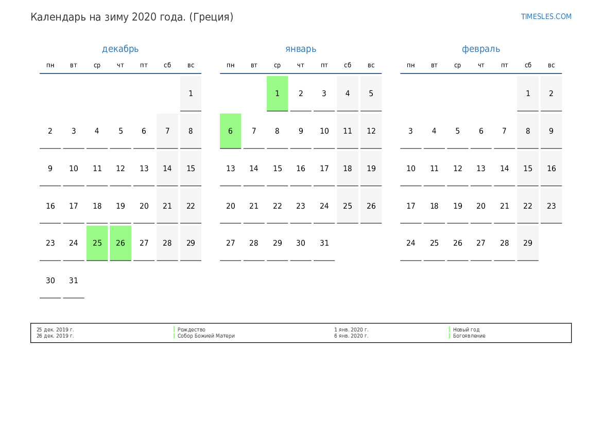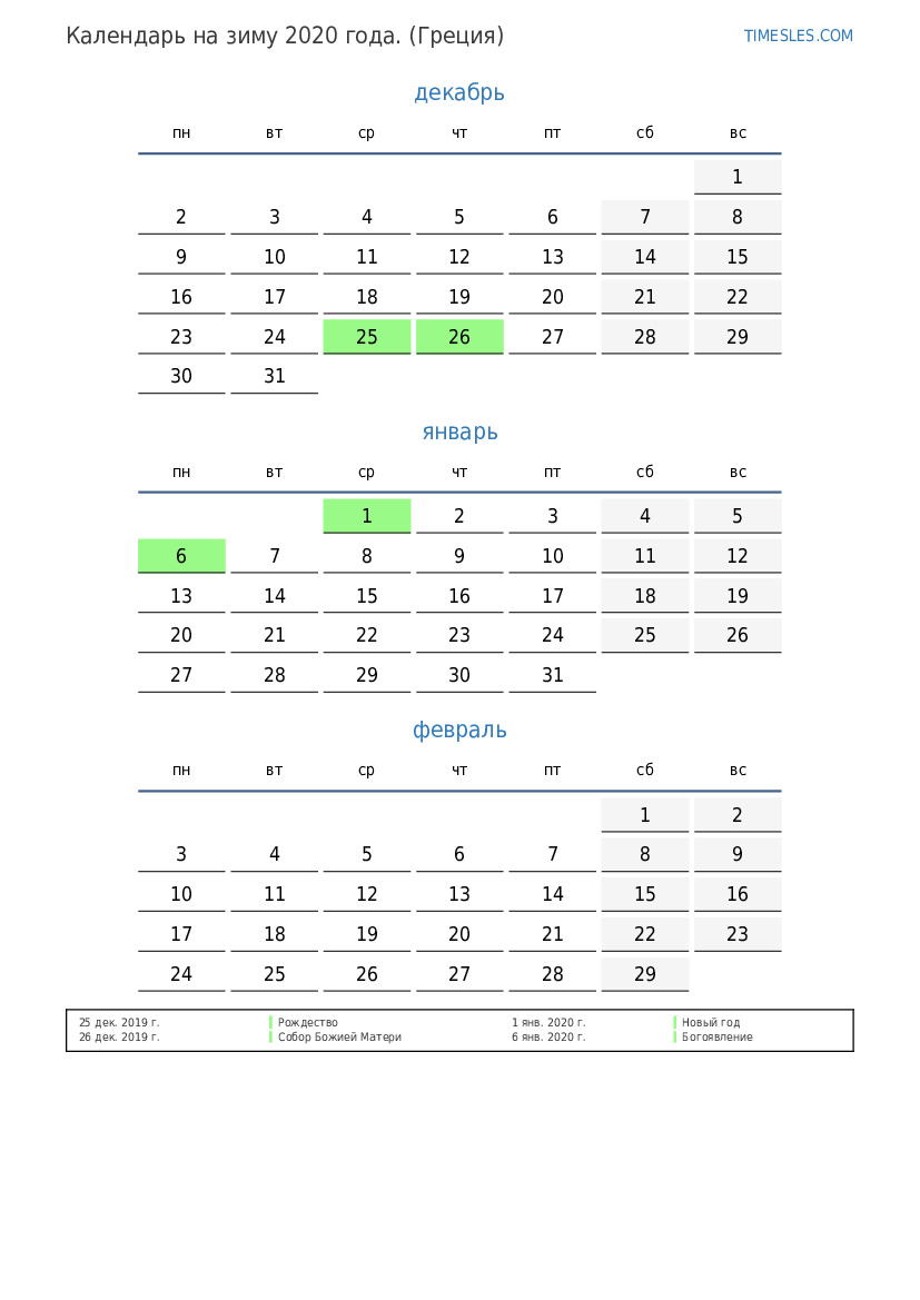 Скачать и распечатать PDF календарь с праздниками и выходными на зиму 2020 года для Греции