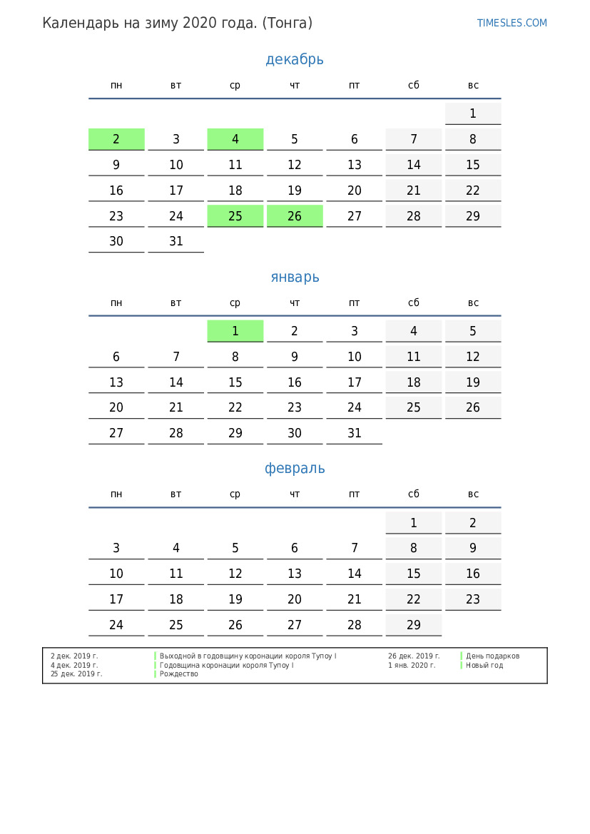 Скачать и распечатать PDF календарь с праздниками и выходными на зиму 2020 года для Тонги