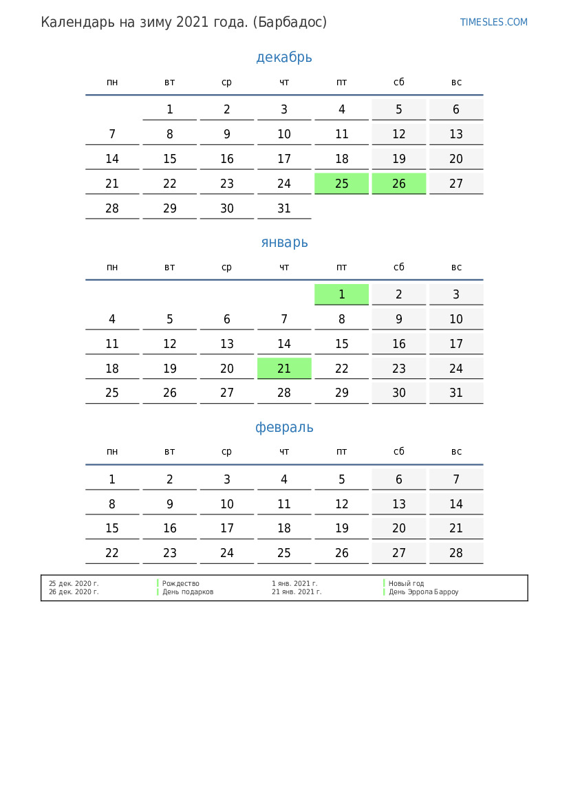 Скачать и распечатать PDF календарь с праздниками и выходными на зиму 2021 года для Барбадоса