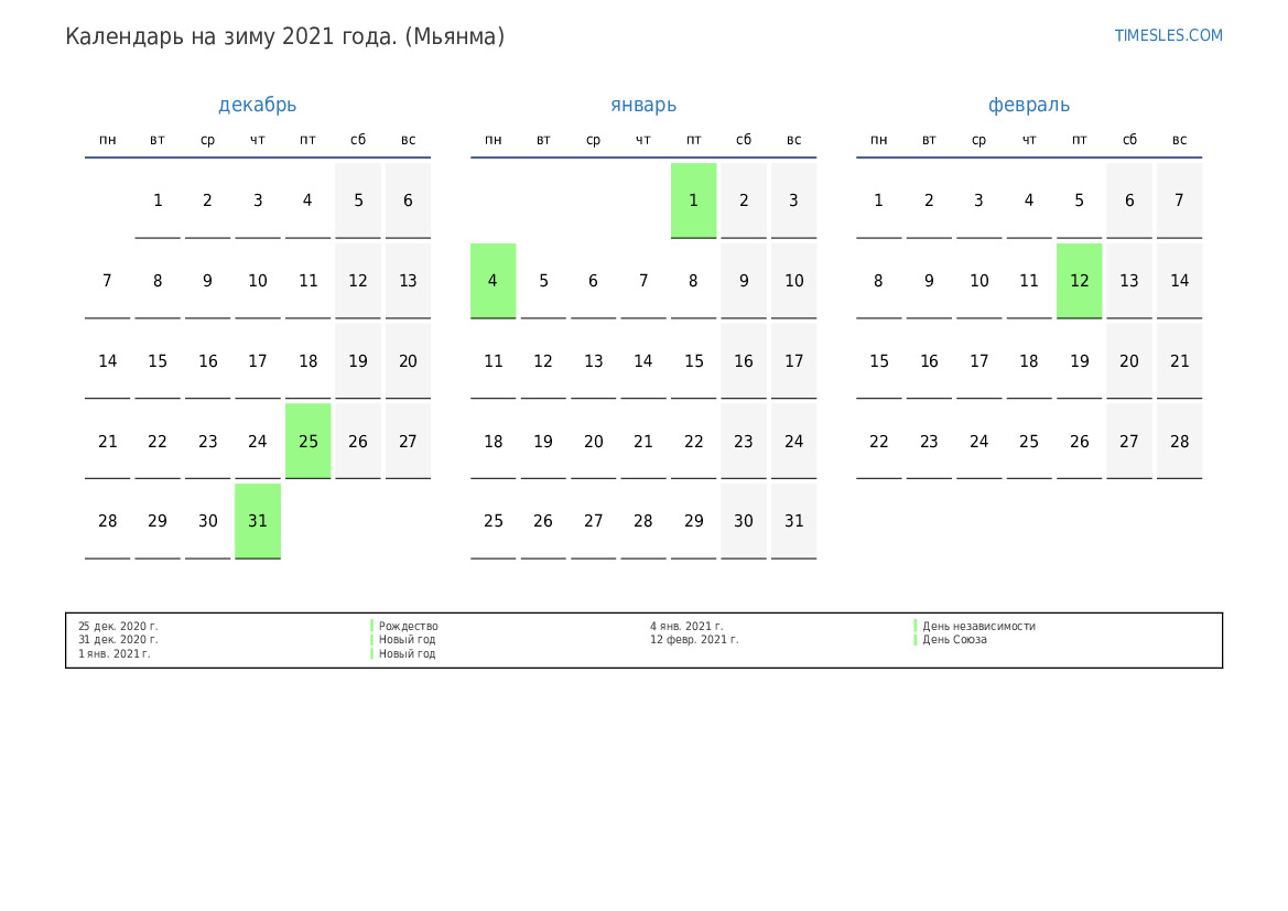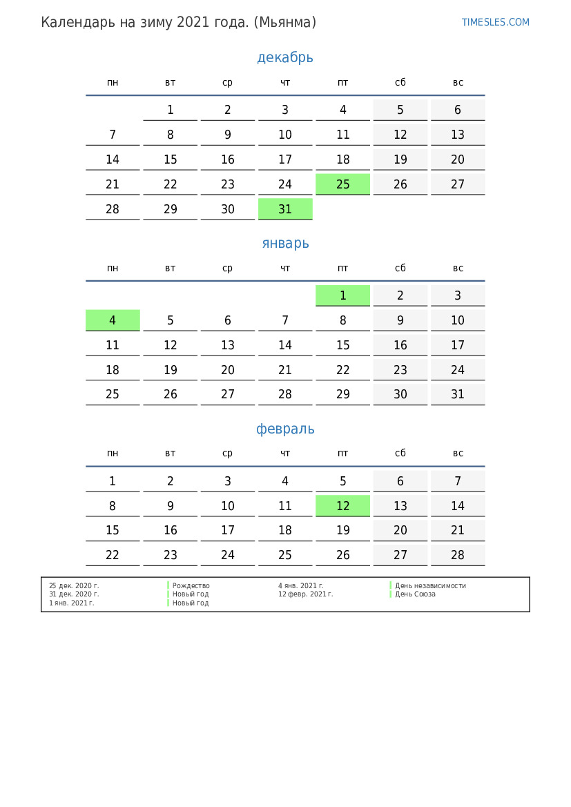 Скачать и распечатать PDF календарь с праздниками и выходными на зиму 2021 года для Мьянмы