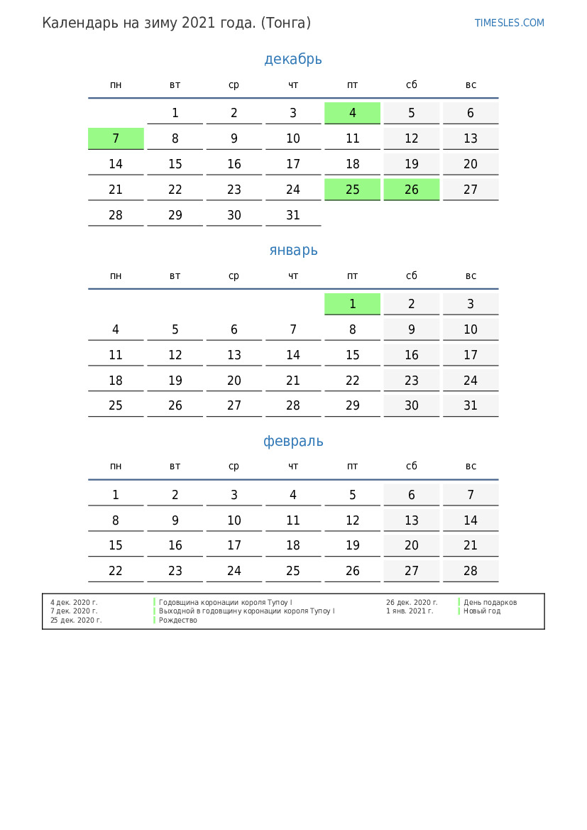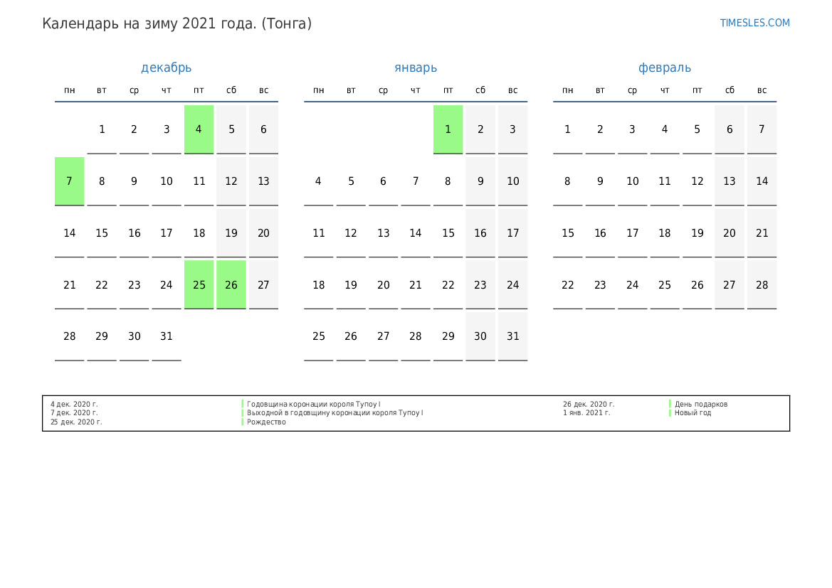 Скачать и распечатать PDF календарь с праздниками и выходными на зиму 2021 года для Тонги