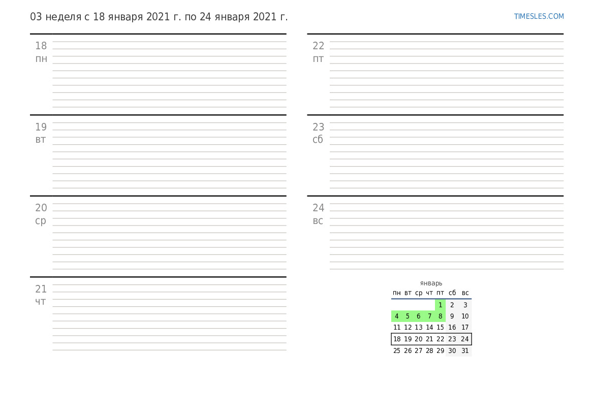Скачать и распечатать PDF календарь, еженедельник на 03 неделю 2021 года, с 18 января 2021 г. по 24 января 2021 г.