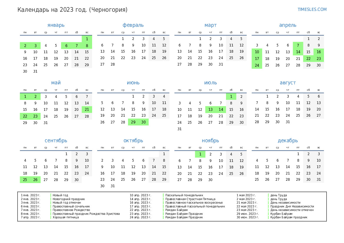 Календарь праздников и выходных дней в 2023 году для Черногории